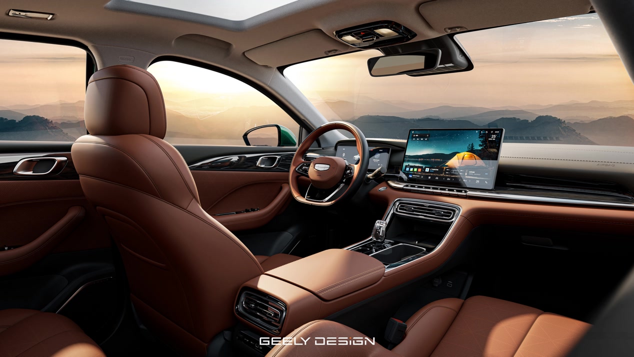 第5代帝豪以东方审美进行全新设计。前脸12根镀铬直瀑立柱象征“十二时辰”传统意象,配合“吉目远眺LED前大灯”实现超170米照射距离。车身采用0.618黄金比例腰线与2.2倍轮高比,搭配1885毫米车身与18英寸五星之盾轮毂,辅以千山青、墨岩黑等六款国风车色,将自然意境融入工业设计。