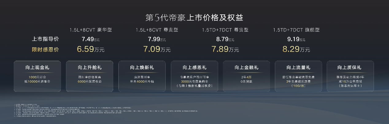 11月18日,吉利第5代帝豪车型正式上市,推出四款配置选择,限时售价6.59万元至8.29万元。2025年11月30日前购车更可享1000元订金抵10000元购车金在内的7重上市礼遇。