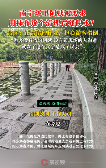 网传南宁一公园保洁员用抹布清理路面上积水,当事公园回应