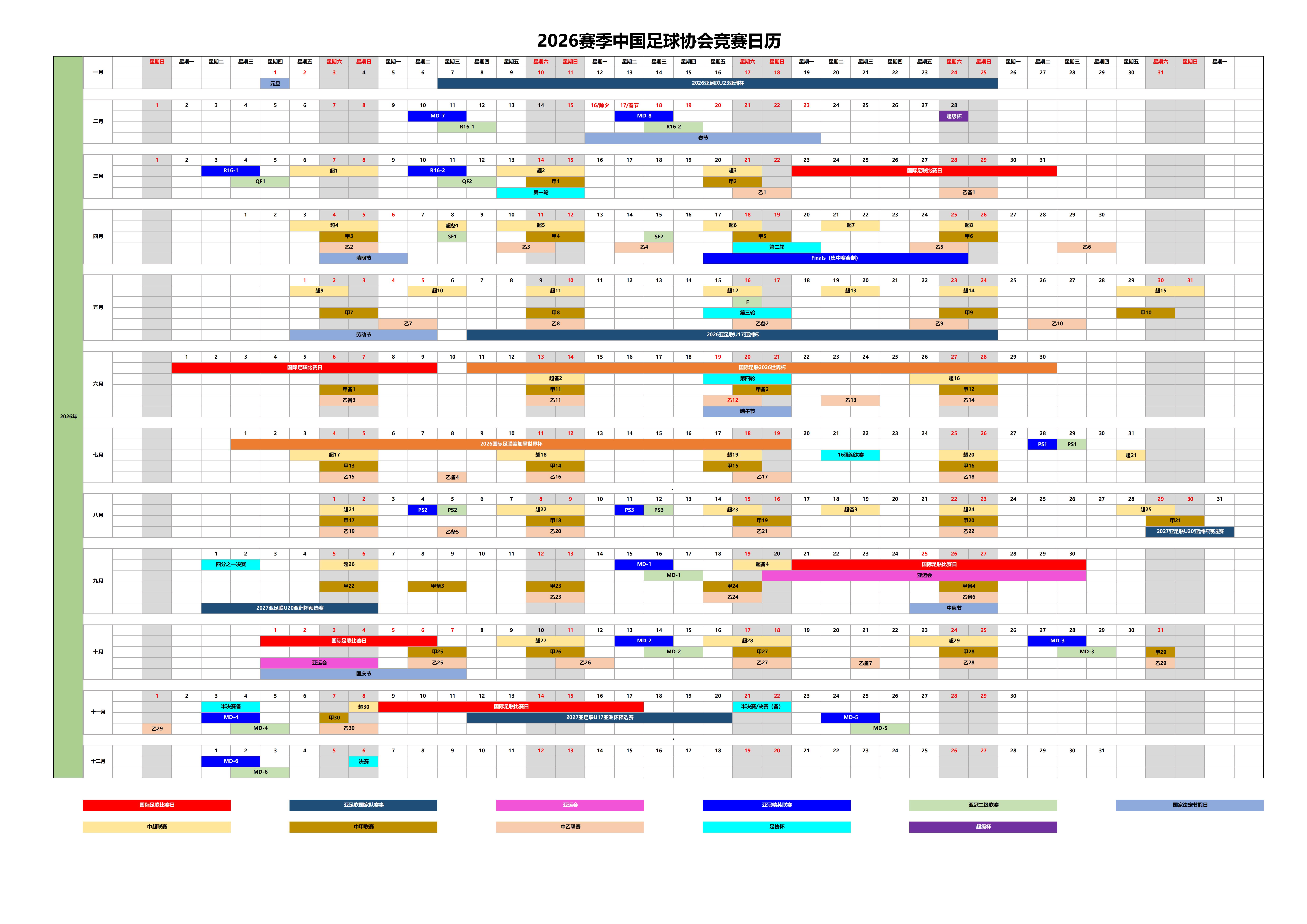 为统筹国家队集训比赛、职业联赛、足协杯赛等相关竞赛事宜,中国足协制定2026赛季竞赛日历(国际足联比赛日、亚足联国家队赛事、亚运会、亚冠精英联赛、亚冠二级联赛、中超、中甲、中乙、足协杯、超级杯),具体如下: