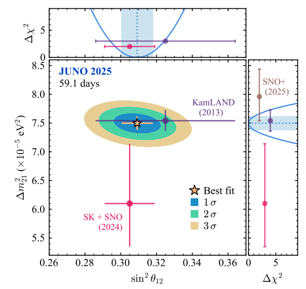 首次发布的物理成果表明JUNO完全达到了实验设计目标。这两个振荡参数最初是通过太阳中微子所测定,但也可以通过反应堆中微子精确测定。此前,这两种方法对质量平方差的测量结果有约1.5倍标准偏差的不一致,被称为“太阳中微子偏差”。