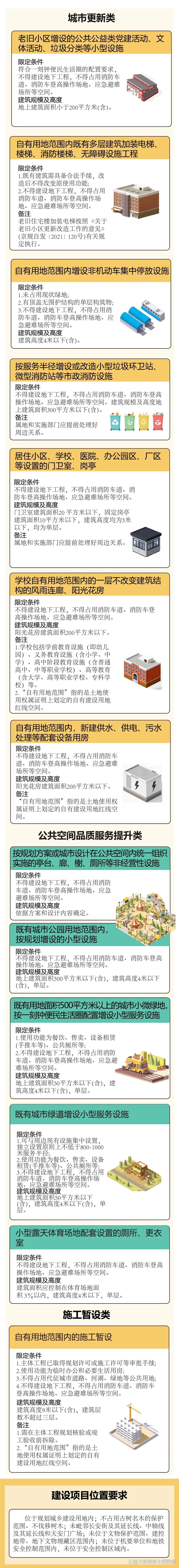 城市更新类(4小类10种):老旧小区增设公共公益类党建活动、文体活动、垃圾分类等设施,既有多层建筑加电梯、楼梯、消防楼梯、无障碍设施,自有用地范围内增设非机动车集中停放设施,以及按服务半径增设或改造小型垃圾环卫站、微型消防站等市政消防设施。