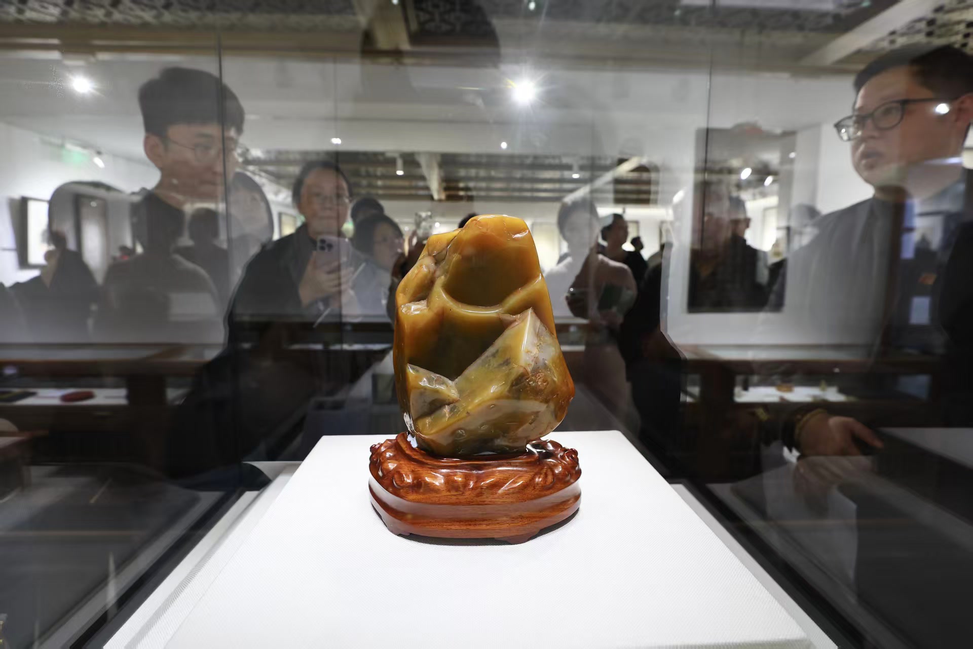 值得一提的是,在精品展上还能看到荣宝斋珍藏的两件国宝级展品,仅供观众一睹为快。其中之一是价值数十亿的“田黄王”,这是被誉为“石中之王”的寿山溪田黄,体量硕大、温润通透,尽显大自然之精华灵秀。还有一对“和硕怡亲王宝”田黄对章,用料讲究、雕工精湛、印文古朴,堪称金石篆刻艺术的瑰宝。