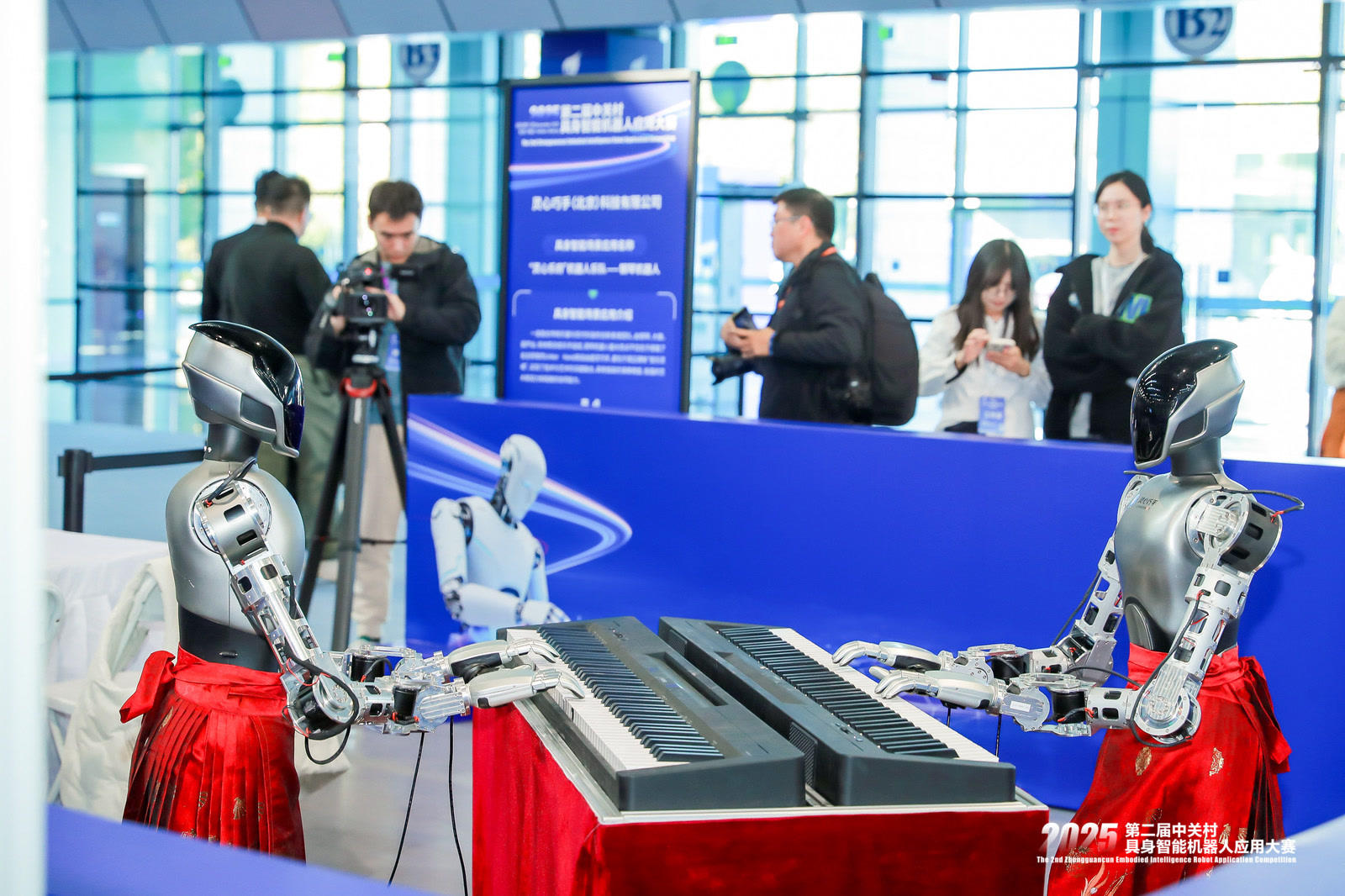两台身着红色马面裙的机器人相对而坐,随着灵巧的机械手指在黑白琴键上跃动,《知否 知否》《青花瓷》等一系列熟悉的旋律从机器人指下倾泻而出,引得现场观众驻足欣赏。赛场一侧,“灵心乐府机器人乐队”正在倾情演奏。