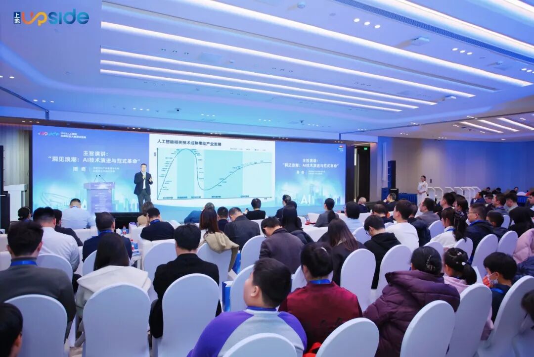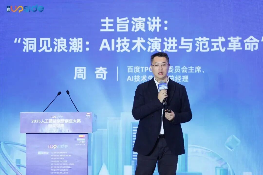 主旨演讲环节,百度TPG产品委员会主席、AI技术生态副总经理周奇以“洞见浪潮:AI技术演进与范式革命”为主题,分享了他对以大模型为核心的AI技术革命发展阶段、百度“芯片-框架-模型-应用”四位一体全栈布局的深度洞察。他表示,通过文心大模型及飞桨深度学习平台,百度正推动AI技术在各行业的深度融合与应用,并致力于通过“伴飞计划”等举措,与上地携手共建繁荣的AI产业生态。