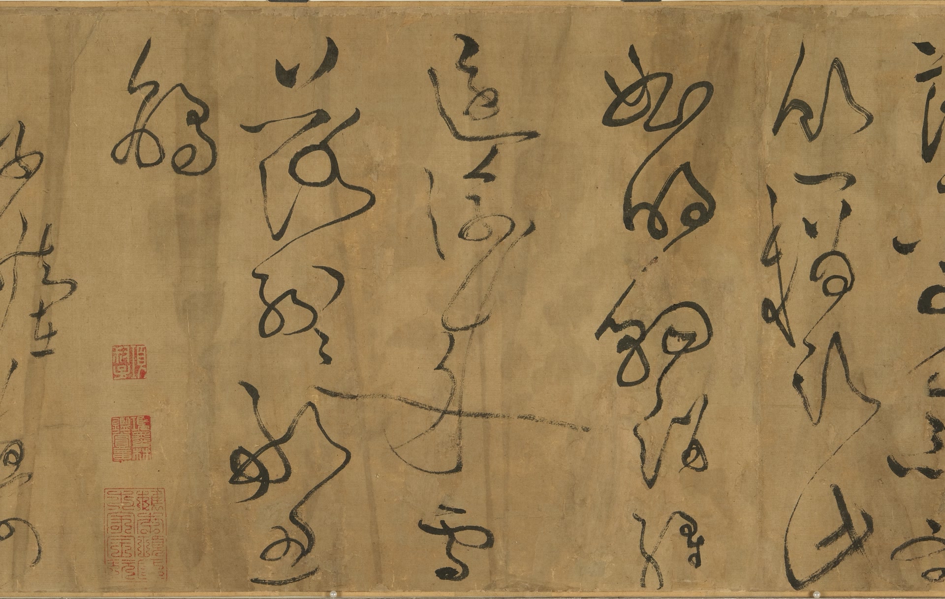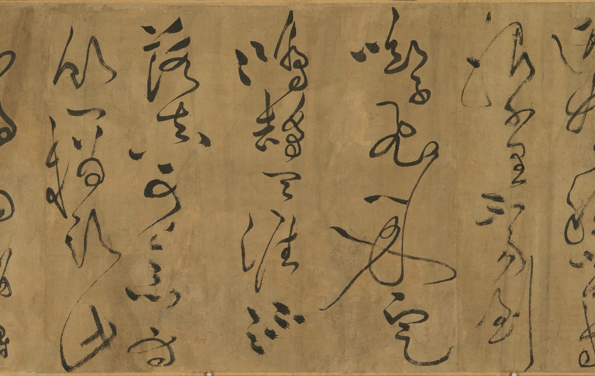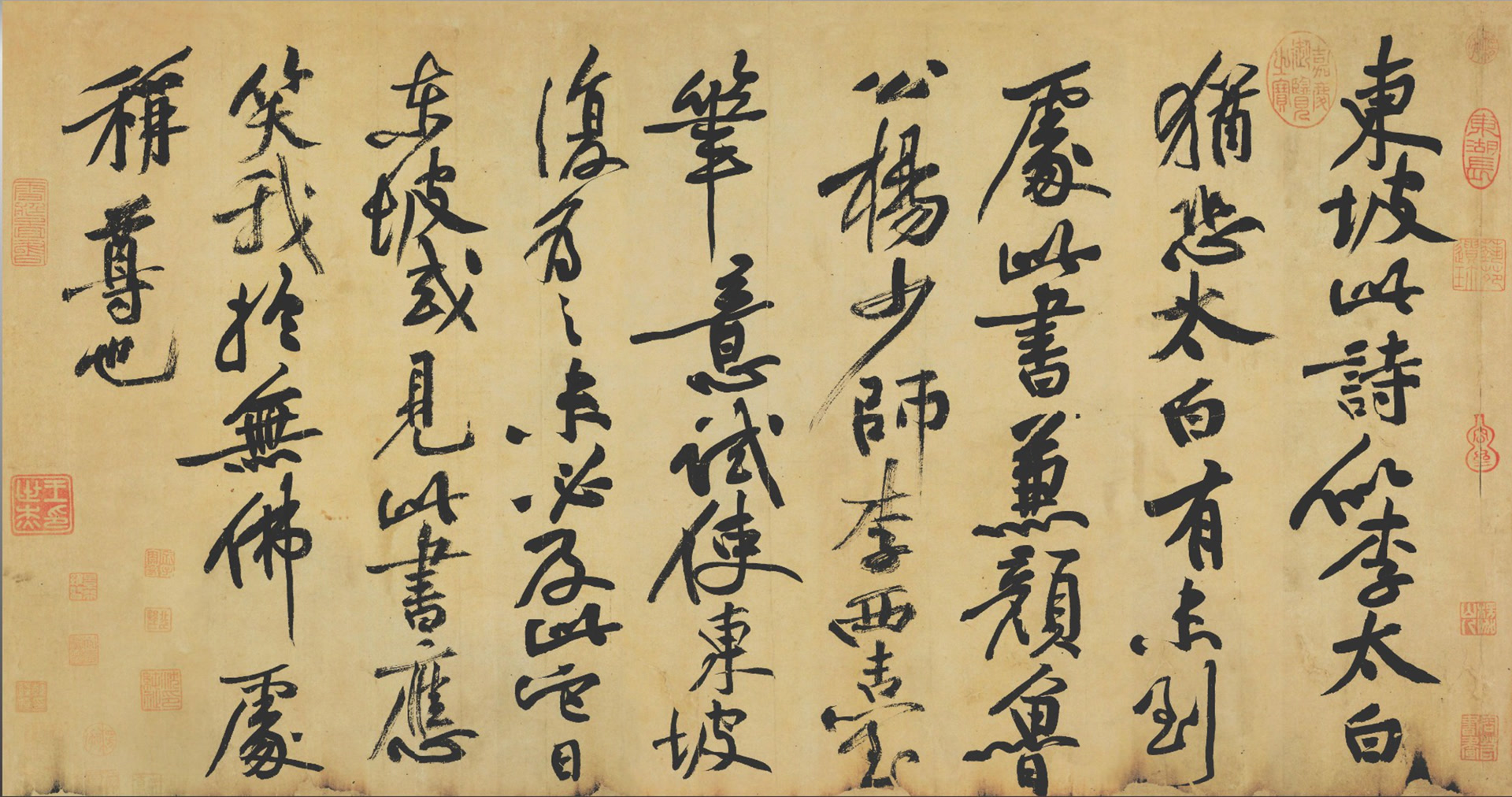 东坡对黄庭坚点拨一二,让他从怀素、张旭的草书中汲取想法。黄庭坚其后的草书风格逐渐豪迈奔逸,飘飘洒洒,在他的长卷《临东坡海棠诗卷》中完全看不到东坡的影子,200余字风驰电掣、惊蛇走虺。在草书近乎“凋零”的时代,黄庭坚研究历代草书大家的名帖和笔法,被同时代词人李之仪奉为“草书第一”。把这幅作品看作是和东坡进行书法比拼,倒不如看作是老师布置作业之后的学习报告。
