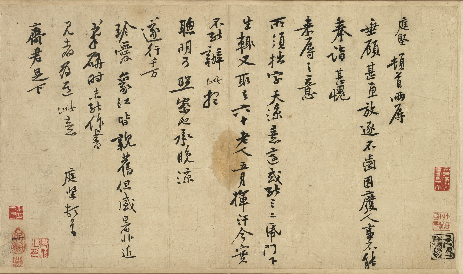 释文:庭坚顿首,两辱垂顾,甚惠。放逐不齿,因废人事,不能奉诣。甚愧来辱之意,所须拙字,天凉意适,或能三二纸。门下生辄又取去,六十老人,五月挥汗,今实不能办此,想聪明可照察也。承晚凉遂行。千万珍爱。象江皆亲旧,但盛暑非近笔砚时,未能作书。见者为道此意,庭坚顿首。齐君足下。