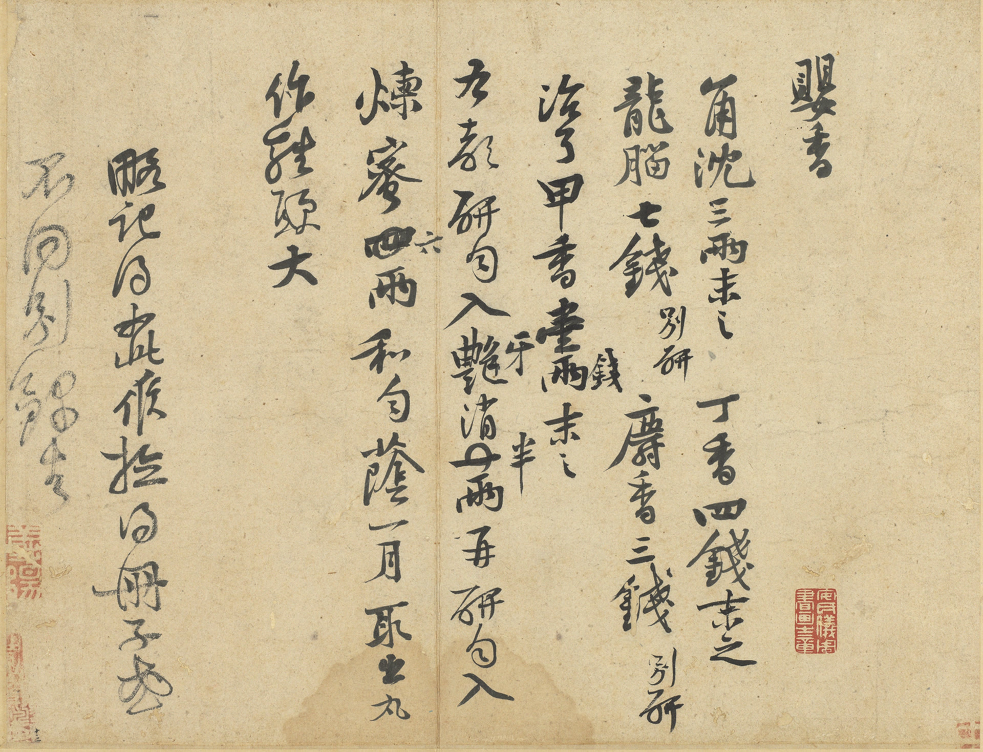 释文:婴香。角沈三两末之,丁香四钱末之,龙脑七钱别研,麝香三钱别研,治弓甲香壹两(旁注钱)末之,右都研匀。入艷(旁注牙)消一(涂改半)两,再研匀,入炼蜜四(涂改六)两,和匀。荫一月取出,丸作鸡头大。略记得如此,俟检得册子。或不同,别录去。