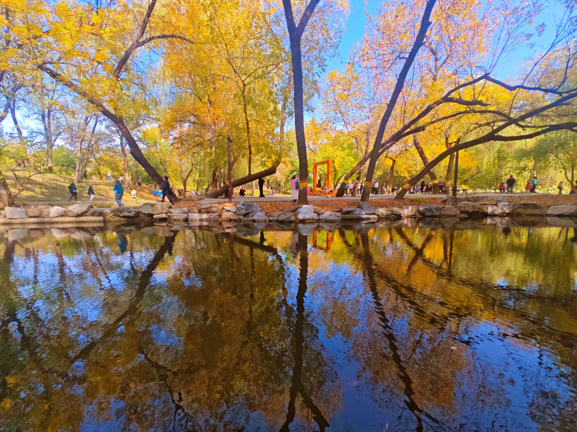 苹香榭的秋,来得早,来得猛——10月中旬,岸边数十株白蜡树齐刷刷率先换上金装。那些岸上真实的树在澄澈的湖水中与虚幻的影相映成趣,深色的树杆和明亮的黄叶倒映在平静如镜的池面上,亦真亦幻,构成一幅幅如诗的画卷。这些像画一样的景致,既有北方秋日的爽朗明快,又不失江南水乡的婉约韵致。