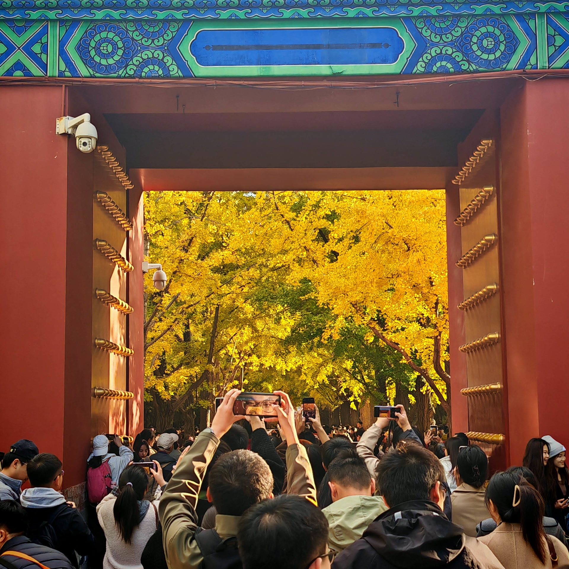 这条银杏大道实在是太美了。前景是威武的门洞,中景是两侧树木形成金色拱廊的银杏大道,远景是庄严的红墙碧瓦祈年殿,背景是湛蓝如洗的秋日晴空。历史与自然在此刻定格,永恒与瞬间在这里交融。