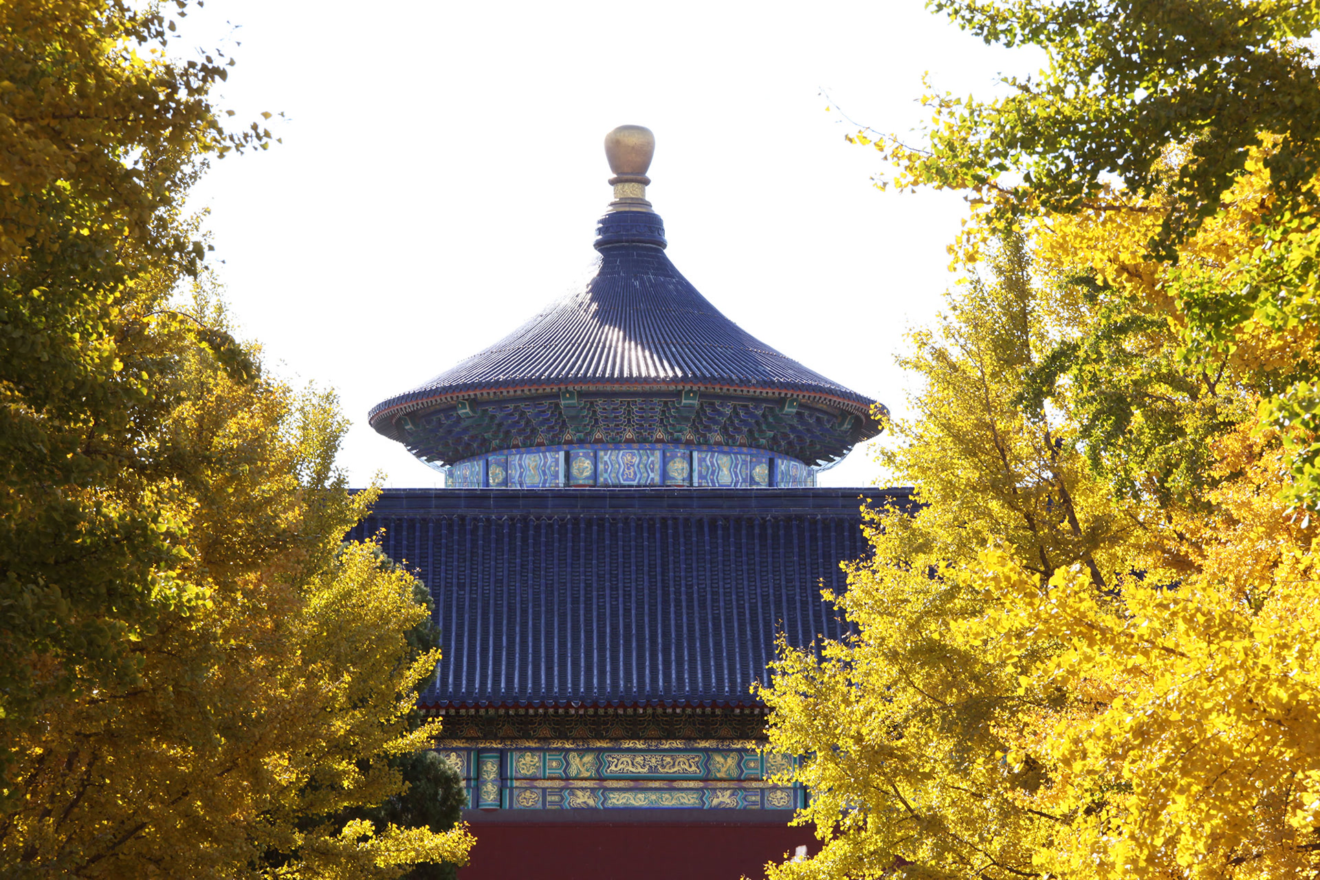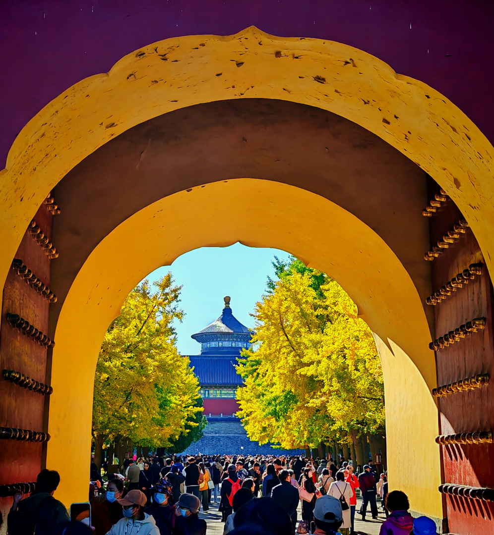 从天坛公园北天门进入,遥望祈年殿的景致更是令人屏息。早晨,初升的太阳率先照亮了祈年殿对应北天门银杏大道左侧的银杏林。10点半后,银杏大道另一侧的银杏林也享受到了阳光的爱抚。当金色的光芒洒满银杏大道,天坛公园最壮观的秋色便完整地呈现在了眼前——巍峨的祈年殿、金黄的银杏大道、深邃的北天门门洞,三者共同构成了一幅无可比拟的秋日画卷。