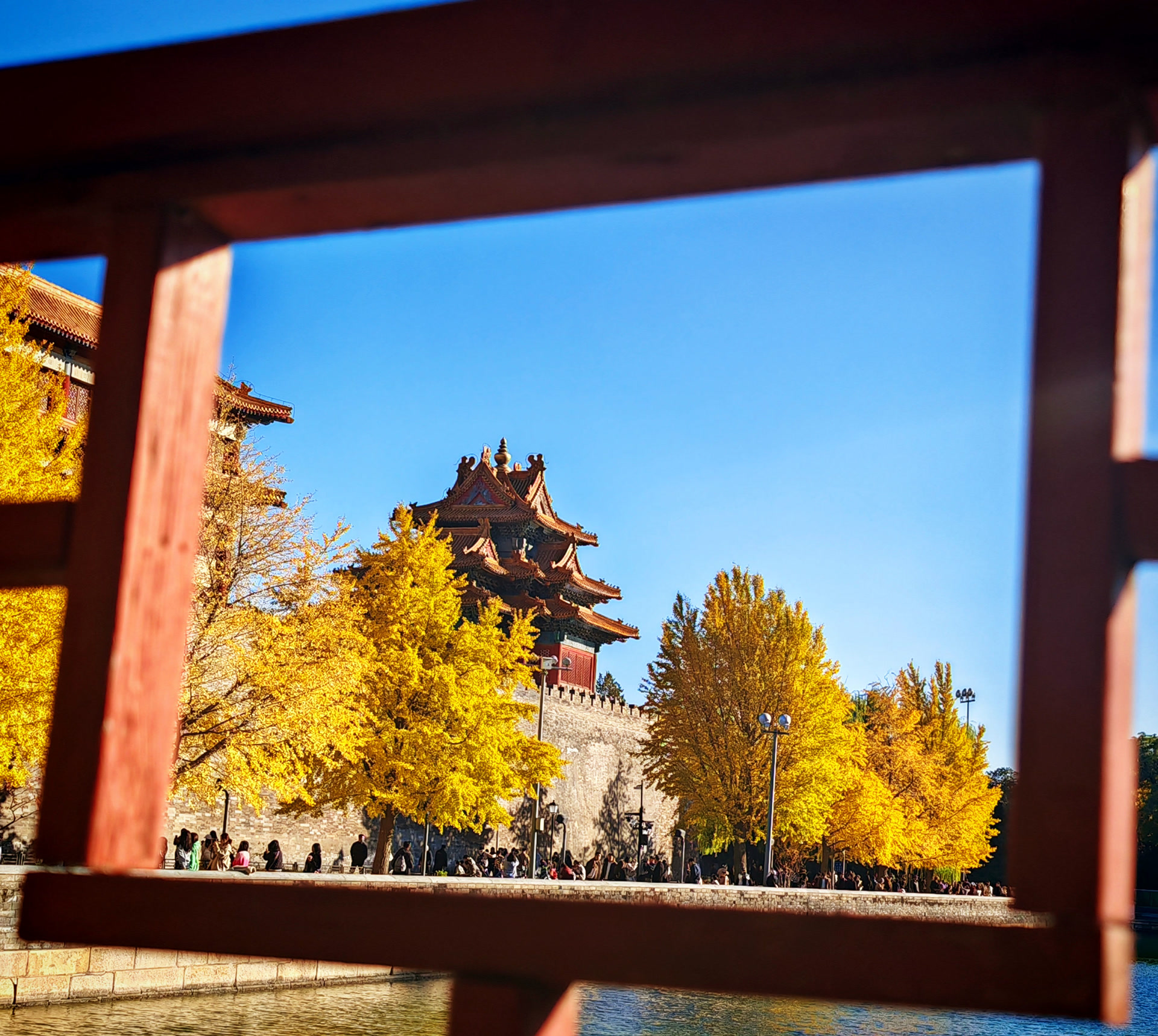 正午时分,摄影爱好者和游客将西北角楼护城河北岸挤得满满当当,阳光给角楼镀上了一层温暖的金色光泽,河岸上的银杏叶在光照下也越发璀璨夺目,与角楼的灰瓦飞檐相映成趣。足足等了半个多小时,直到人群稍显稀疏,才终于捕捉到角楼与黄叶完美相映的画面。