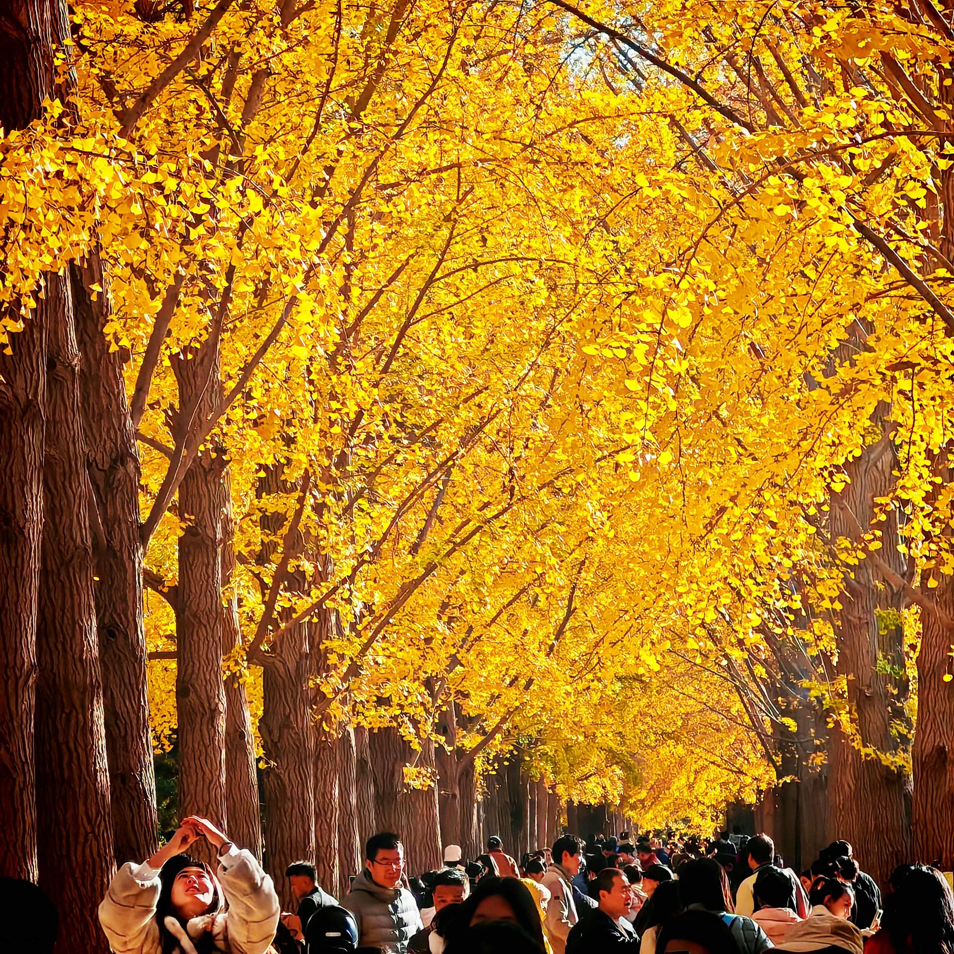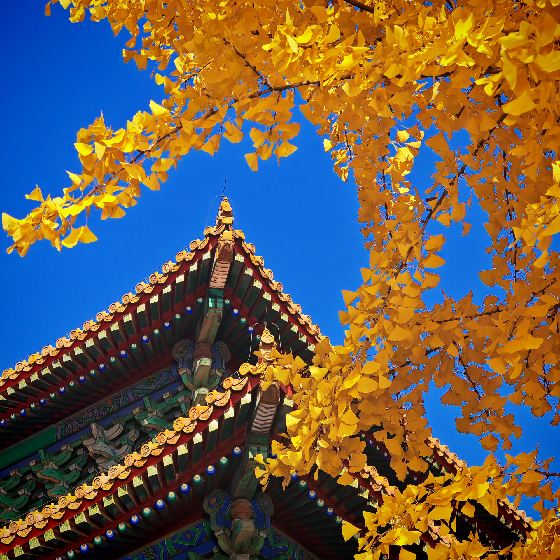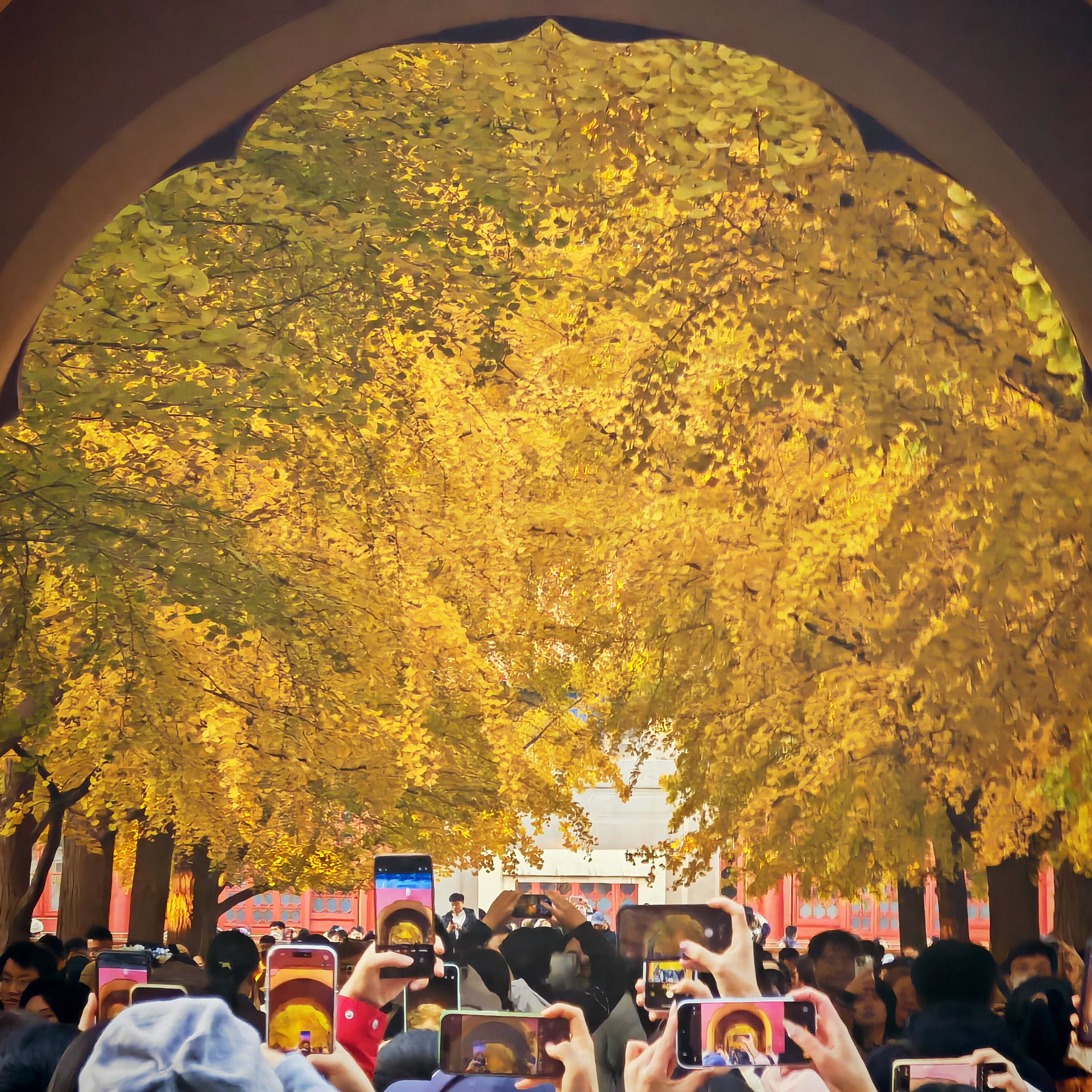 走进祈年殿西北隅的银杏林,仿佛步入了一个金色的殿堂。数百株银杏树整齐列队,枝头挂满金黄,地上落叶铺金,天地之间被渲染得辉煌而庄重。