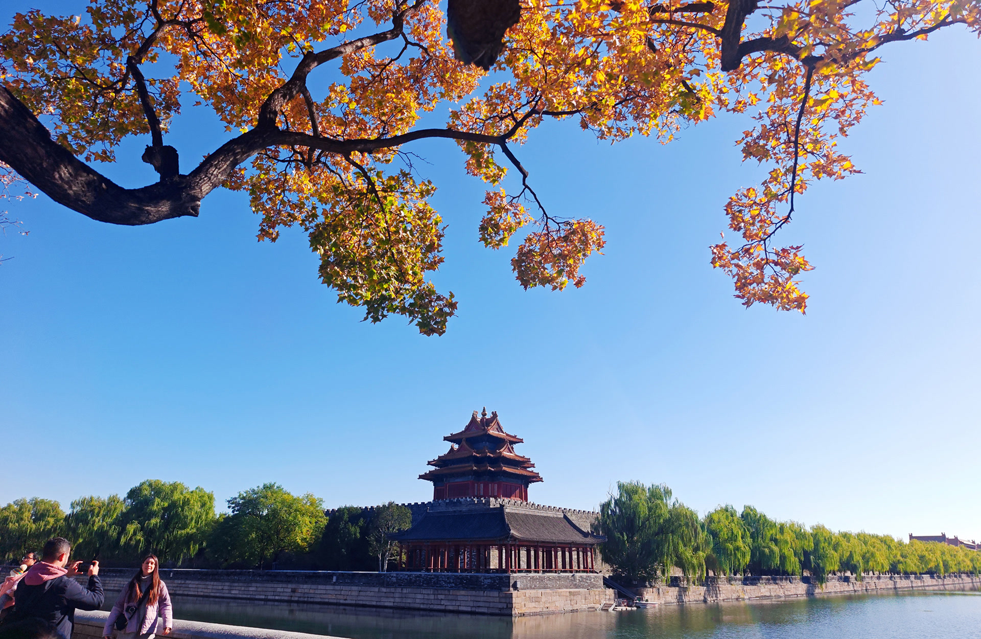 11月上旬的故宫,护城河畔的银杏、白蜡、枫树已是五彩缤纷,与朱红宫墙相映,宛如一幅浓墨重彩的古典油画。