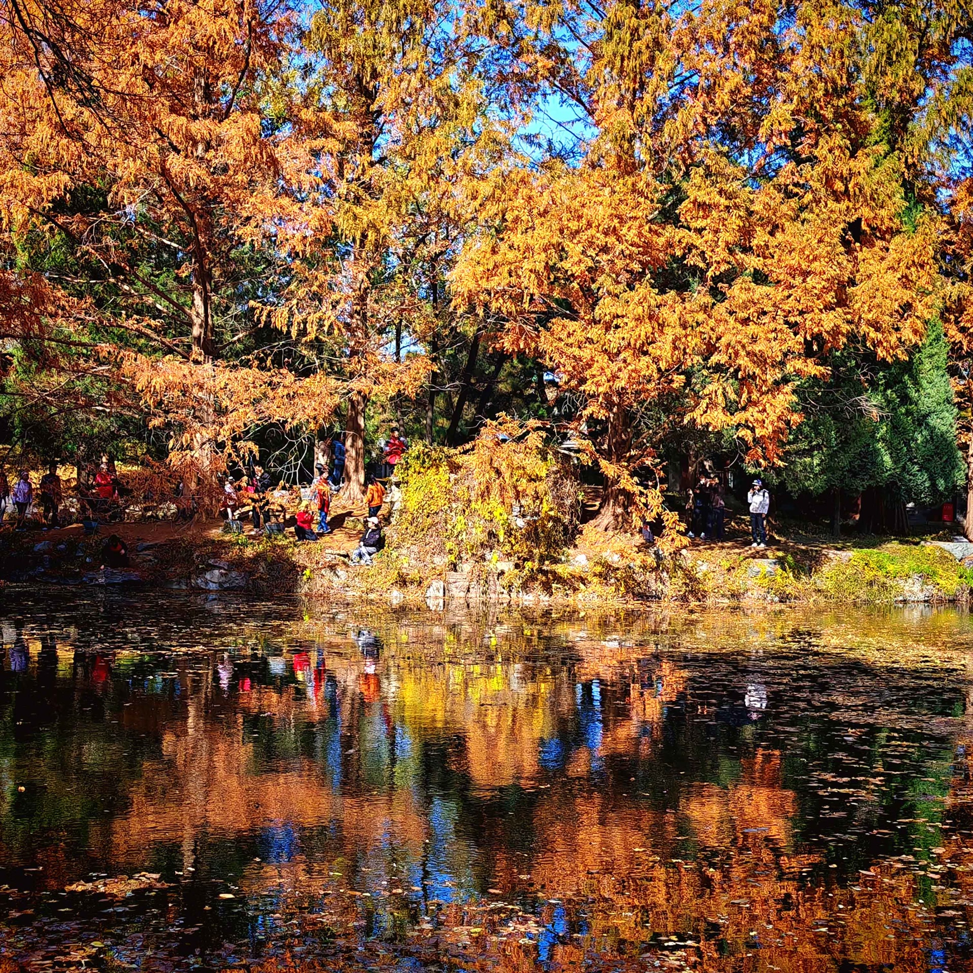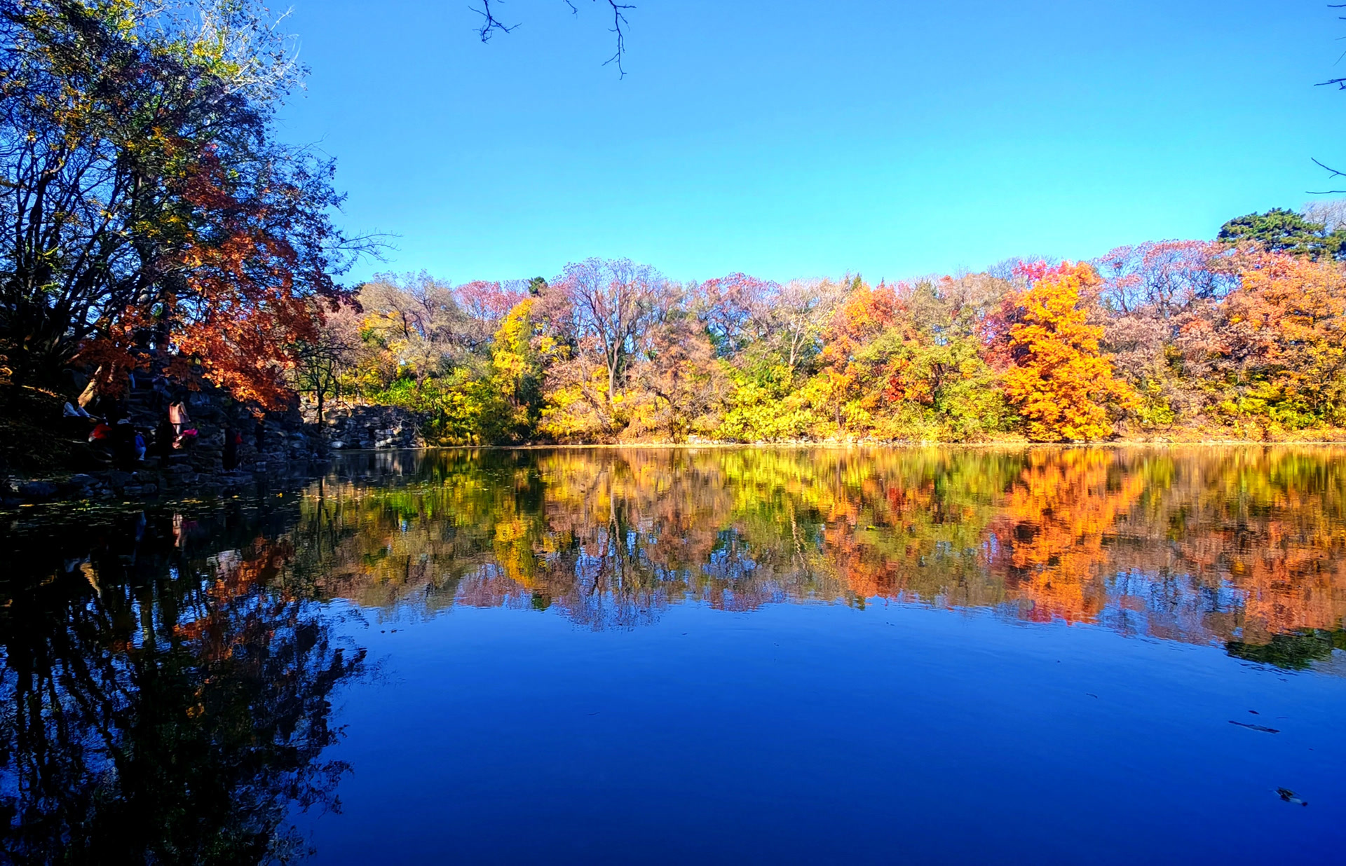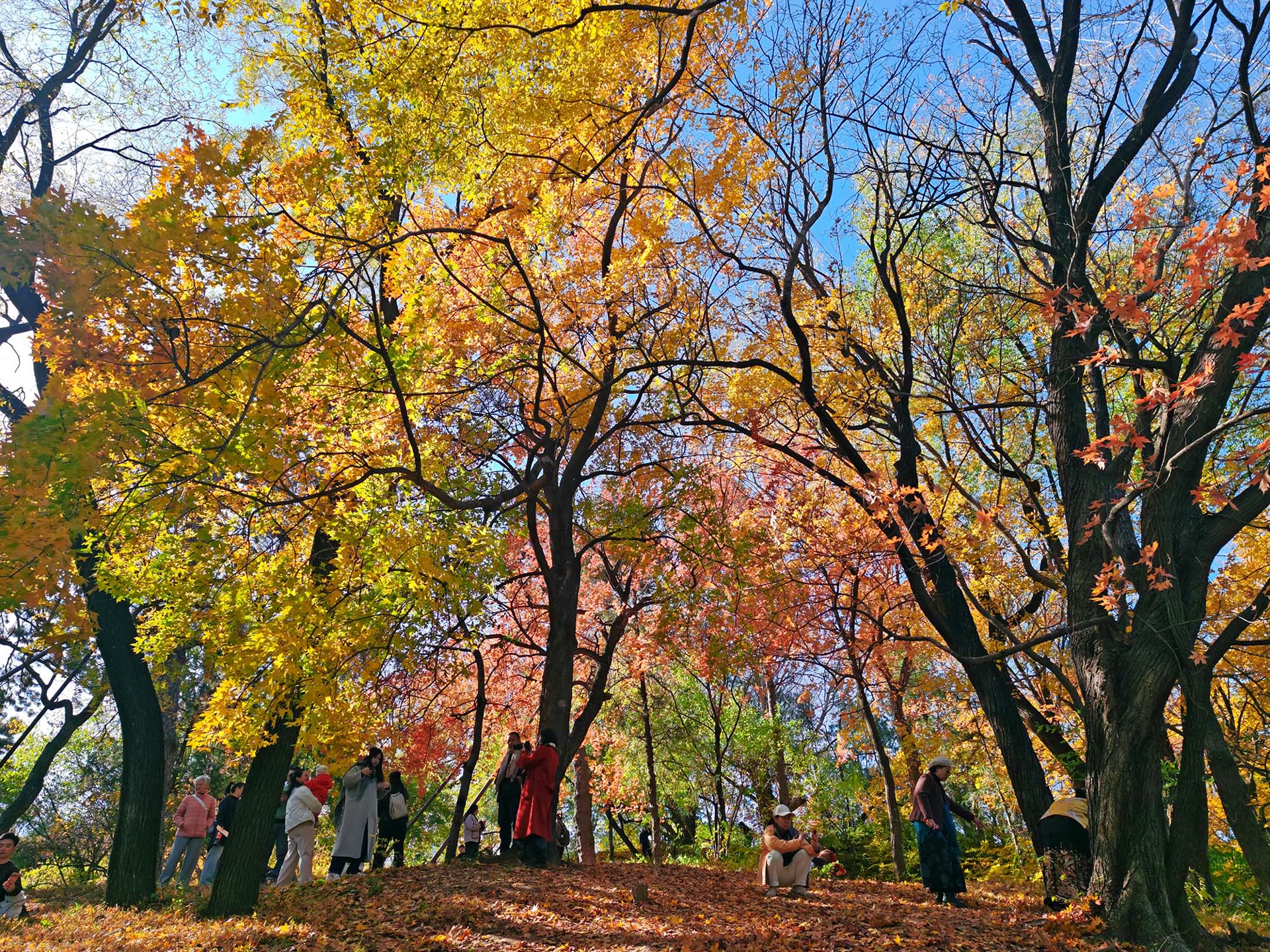 沿着石阶缓步走上后湖山坡,眼前又是另一番景象。抬头望去,天空湛蓝如洗,澄澈得没有一丝杂质。眼前的树叶金黄似鎏金,火红如晚霞,在蓝天的映衬下愈发绚烂夺目。一众众男男女女、老老少少、国内国外口音混杂的游客,竞相在“秋景图”里寻景拍照。偶然,几只鸟儿飞过林间,又为静美秋色添上灵动的一笔。
