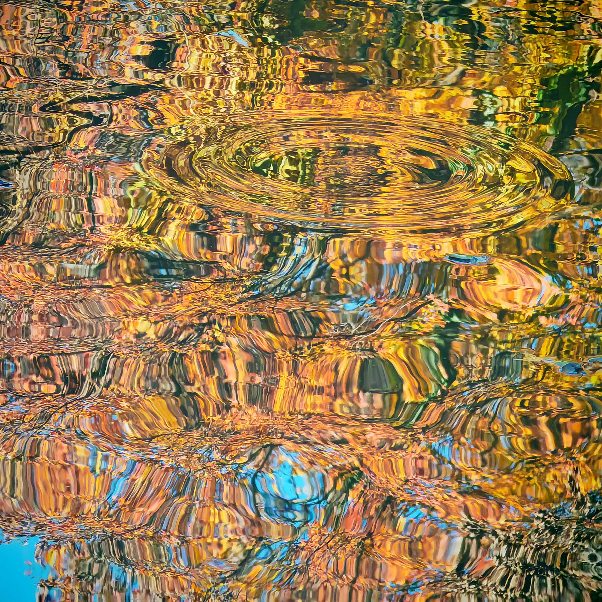 绝绝色!每次在涟漪泛起的瞬间——水中的色彩就像是被打翻了的调色盘,金黄色、赭褐色、绯红色、翠绿色、宝蓝色,在一道道波纹中交织,在一道道波纹中荡漾。似乎每一道涟漪,都是赞美秋日的诗行。