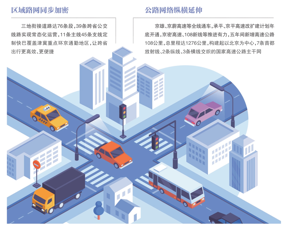 公路网络纵横延伸。京雄、京蔚高速等全线通车,承平、京平高速改扩建计划年底开通,京密高速、108新线等推进有力,五年间新增高速公路108公里,总里程达1276公里,构建起以北京为中心,7条首都放射线、2条纵线、3条横线交织的国家高速公路主干网。区域路网也在同步加密,三地衔接道路达76条段,39条跨省公交线路实现常态化运营,11条主线45条支线定制快巴覆盖津冀重点环京通勤地区,让跨省出行更高效、更便捷。
