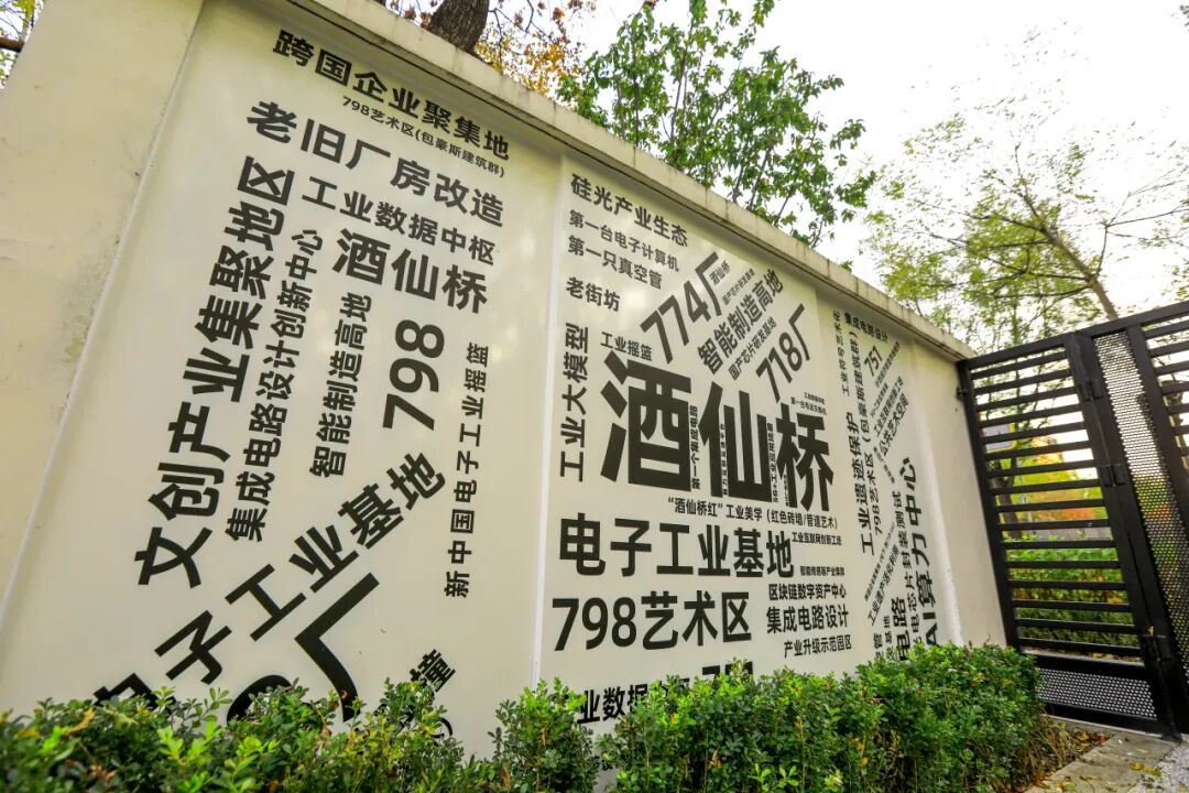 为了让文化墙更具表现力和吸引力,酒仙桥街道深挖区域文化,在墙面融入历史线索,并提升空间趣味,工业遗产区通过不锈钢的艺术造型字体,唤醒电子工业记忆,一个个带有“老厂房”的数字符号,不仅让年轻一代能够感受到父辈们曾经的辉煌岁月,同时也让老一辈从业者能够寻找到深藏于记忆深处的情感共鸣。