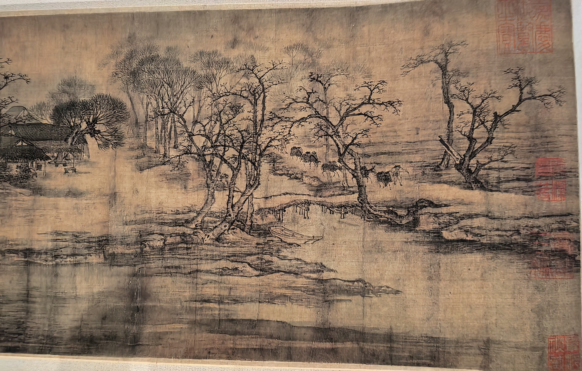 终于,我站到了这幅传奇画作面前。展柜的玻璃擦得一尘不染,仿佛不存在任何阻隔。根据故宫博物院官方资料,此画纵24.8厘米,横528厘米,绢本设色。展柜旁的说明牌上详细记载着这幅画的流传经历:它曾入藏北宋、金、元、明、清宫廷,历经多位帝王鉴赏,上面盖着数十枚收藏印章,每一枚都在诉说着一段历史。