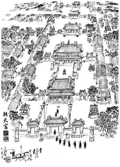 据史料,朝天宫位于北京西城区阜成门内,建于明代宣德八年(1433),仿南京朝天宫式样建成。宫内有三清殿、通明殿,以及普济、景治、总制、宝藏、佑圣、靖应、崇真、元昌、元应九殿等。明代设道箓司于此,为当时北京规模最大的道教宫观。明成化十七年(1481)重修后建万岁殿、钟鼓楼等数千间建筑。天启六年(1626)因火灾焚毁十三重殿宇,现仅存宫门口头条至五条、宫门口等地名。