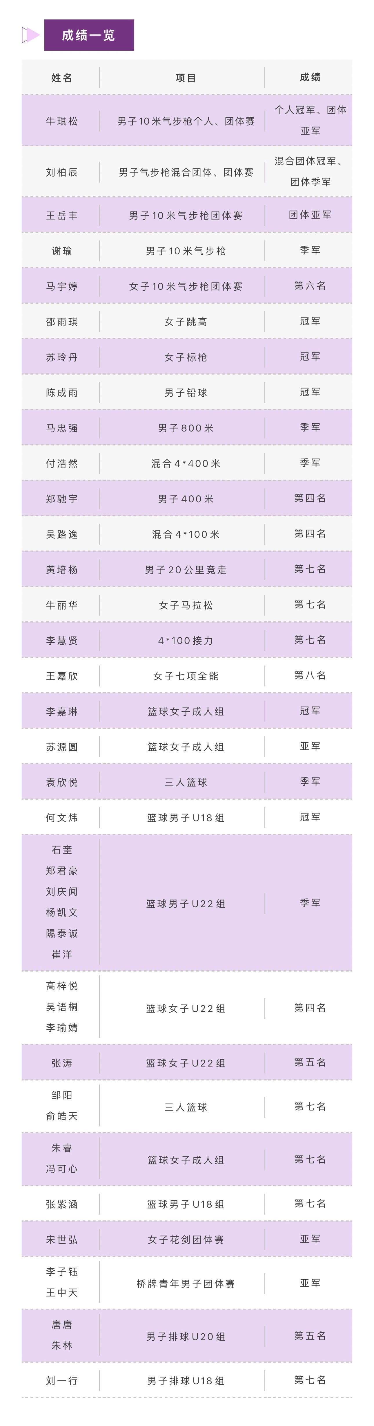 经管学院2023级本科生李嘉琳与队友共同获得篮球女子成年组冠军,社科学院2022级研究生苏源圆与队友共同获得篮球女子成年组亚军,经管学院2022级本科生袁欣悦与队友共同获得三人篮球女子组季军。