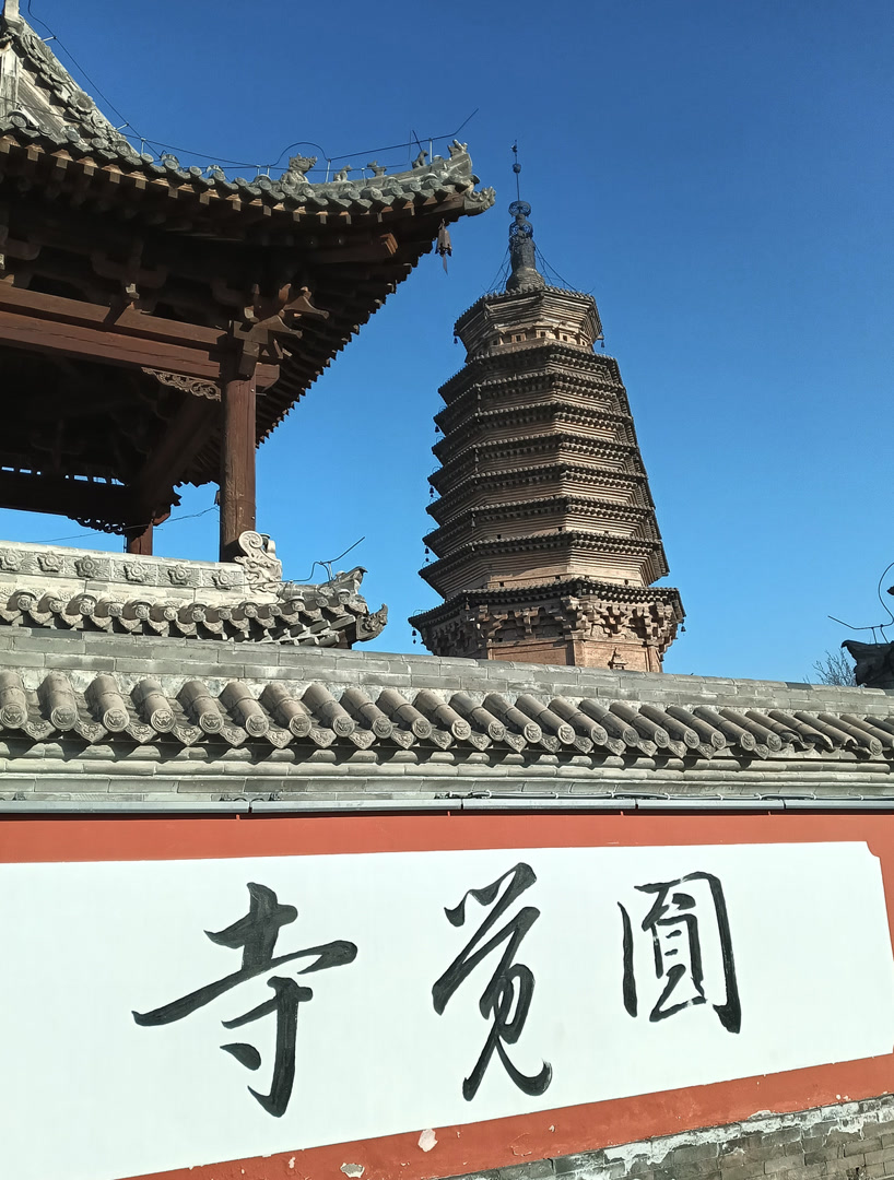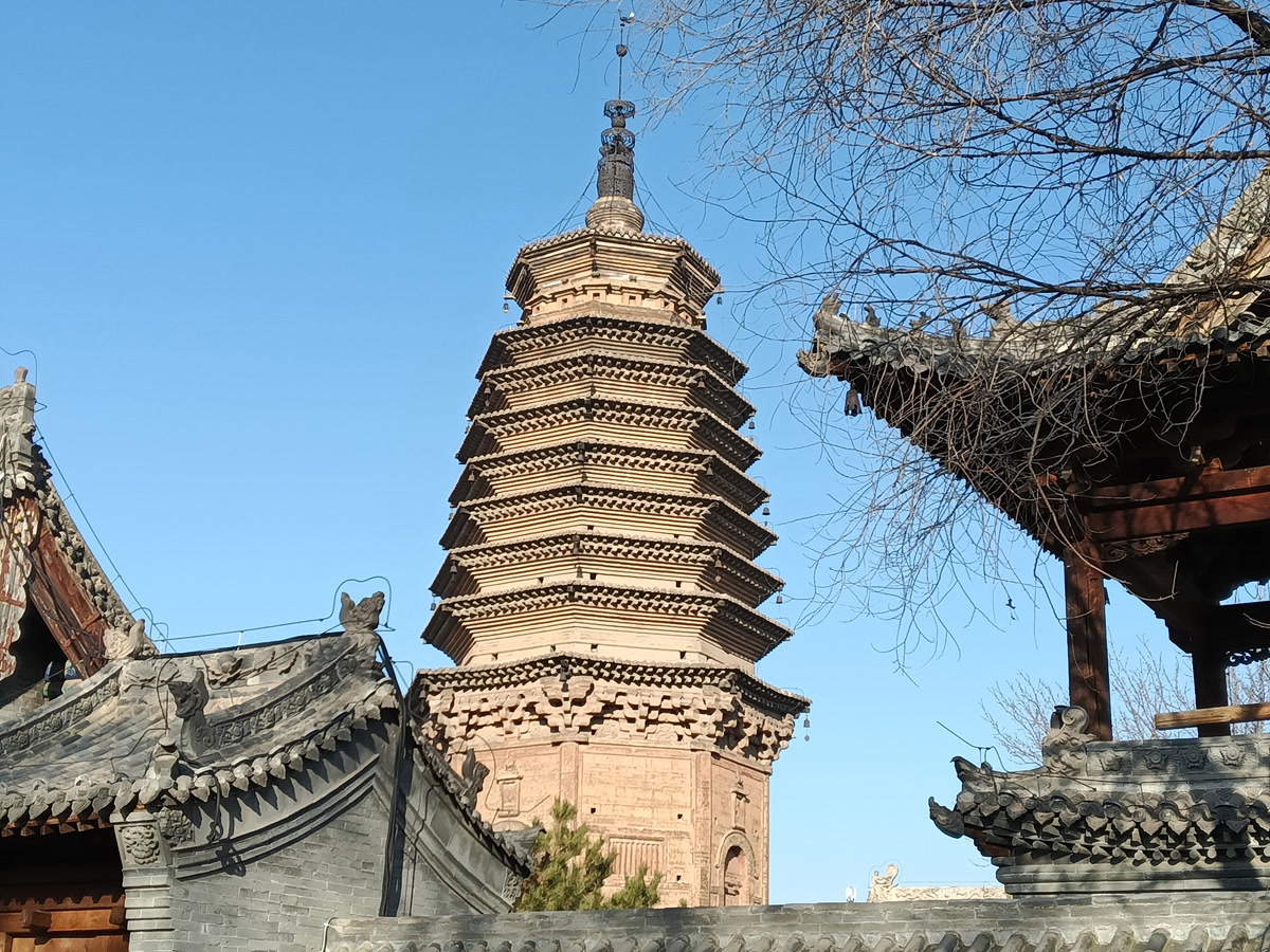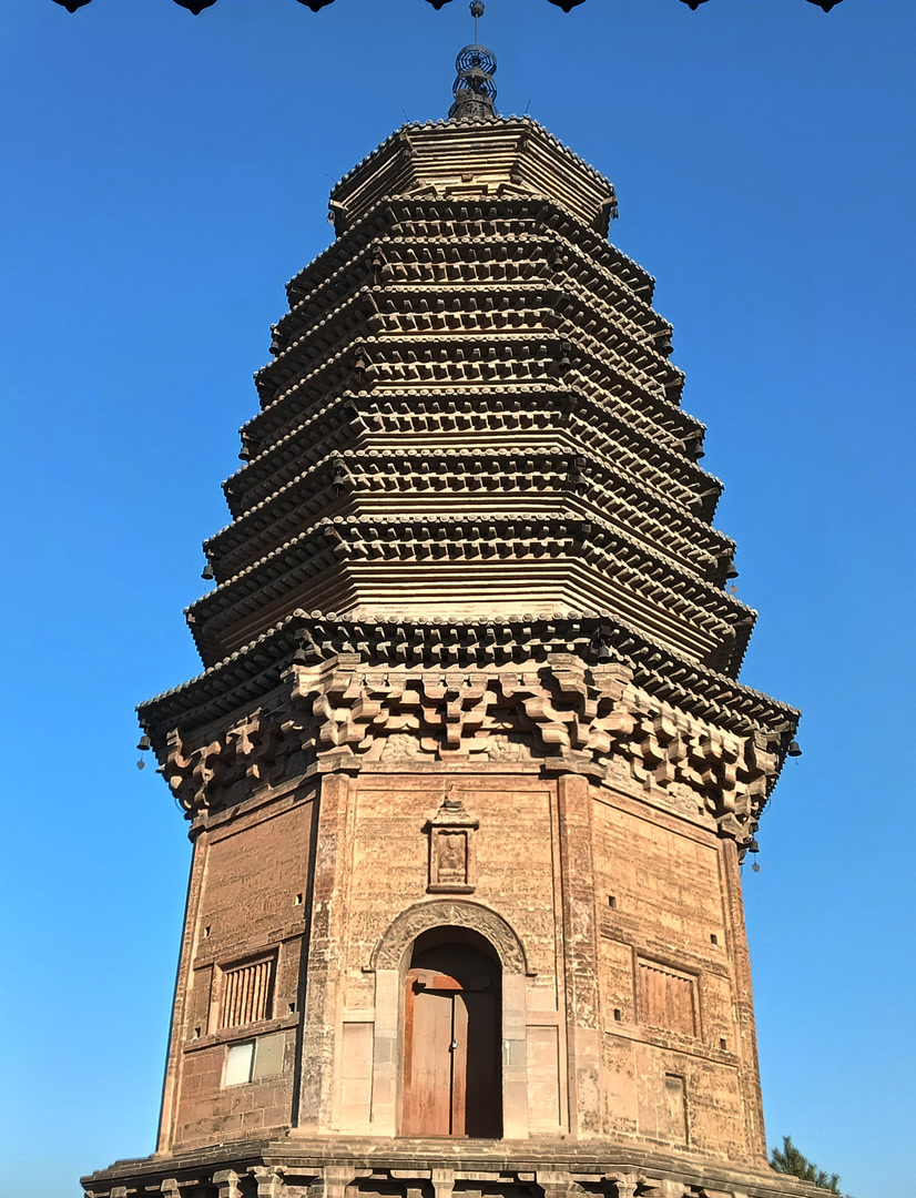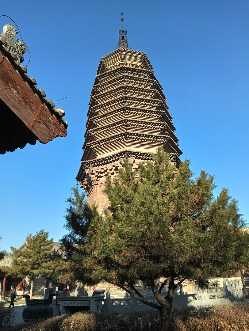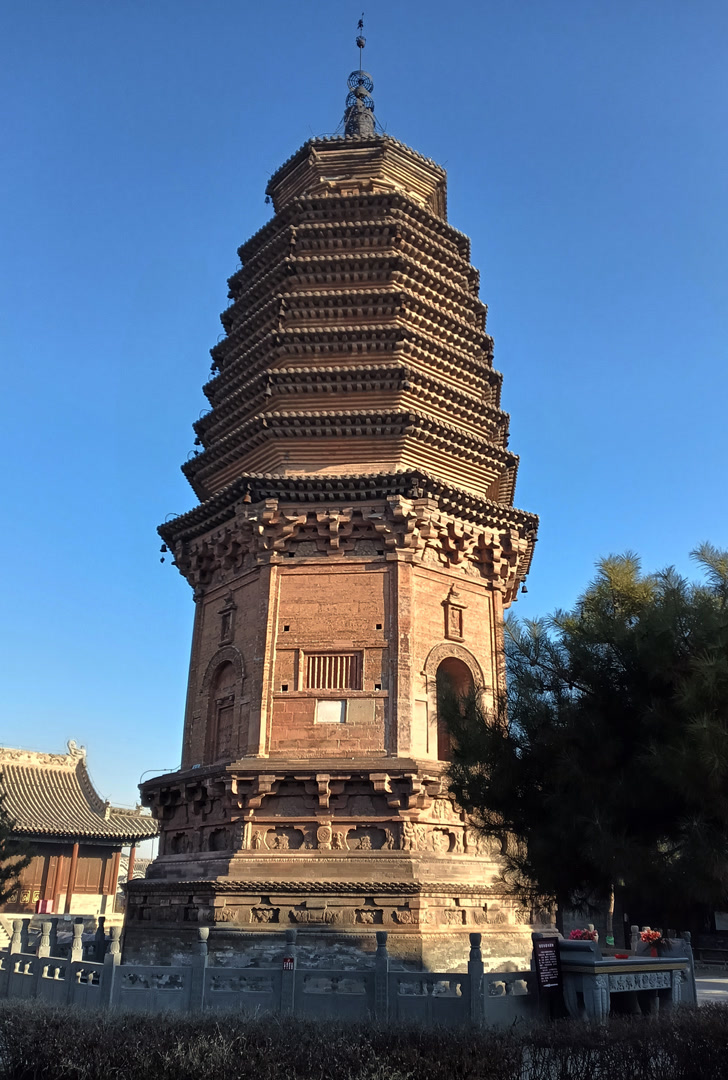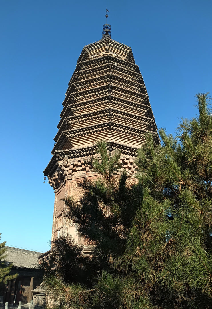 寺庙始建于金代正隆三年,原寺规模宏大,但历经战火,尤其日军炮火,大部分殿宇已毁,仅剩此塔。砖塔呈八角形,共有九层,塔身布满精美的砖雕。力士、歌舞伎、门窗、栏杆,无一不精,是典型的辽金风格。