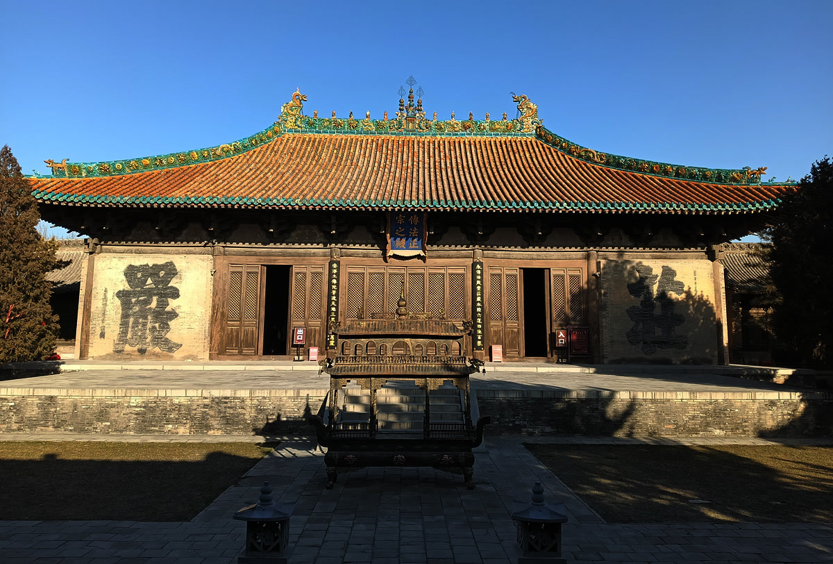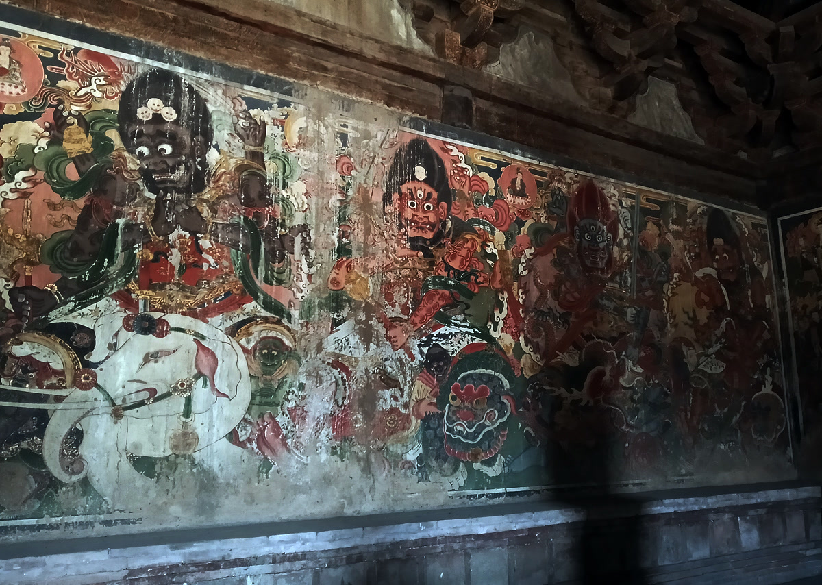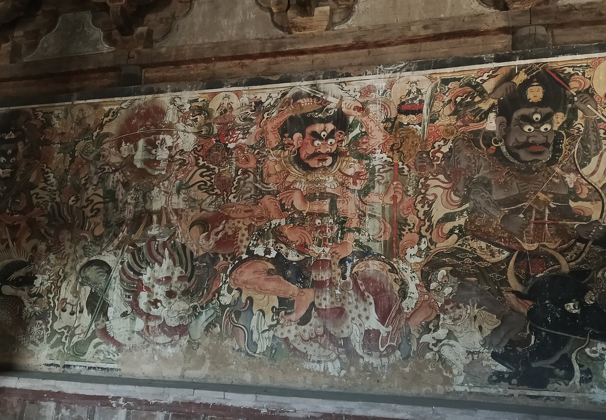 永安寺始建于金代,后毁于火,如今,看到的这座恢宏建筑群,是元代初年重建。步入主殿“传法正宗之殿”,殿内光线幽暗,一股混合着古老木料与尘土的气息扑面而来。整整八百七十平方米的元代壁画,如一幅恢宏的幽冥长卷,在眼前徐徐展开。儒、释、道三教人物,天神地祇、阎罗鬼卒、忠臣烈女……近九百个形象密密麻麻,却井然有序。人物线条如行云流水,色彩虽历经七百年依然艳丽。最令人震撼的是北壁的十大明王,他们怒目圆睁,肌肉偾张,仿佛下一秒就要破壁而出,其艺术张力足以与永乐宫壁画媲美。