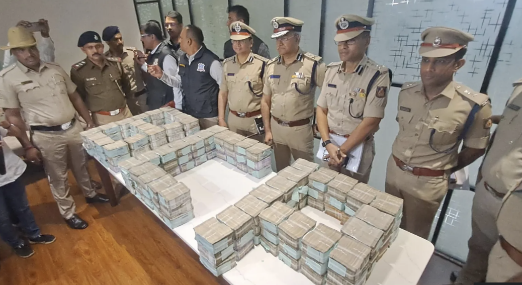 当地时间22日,班加罗尔警方在新闻发布会上宣布追回被劫走的5760万卢比。图源:英媒