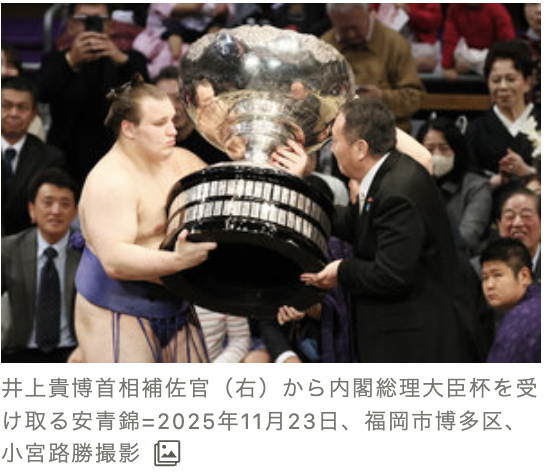 《朝日新闻》报道称,在高市早苗当选自民党总裁后,曾向相扑协会发出问询函,其中提及 “若高市氏就任首相后希望亲自颁发总理杯,协会将如何应对” 等问题。相扑协会当时回应表示:“我们认为,传承大相扑的传统文化是自身的使命。”