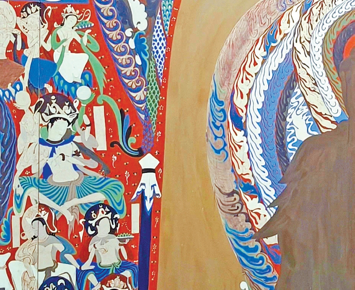 这四面壁画的任务各有侧重:南北壁与顶坡如实再现岁月斑驳与残缺;西壁则是更大挑战,学生们决定复原当年色彩与线条。为此,她们对照同时期莫高窟第249窟和榆林窟壁画风格,在草稿纸上反复比对推敲,只为找回千年前的笔触与气韵。