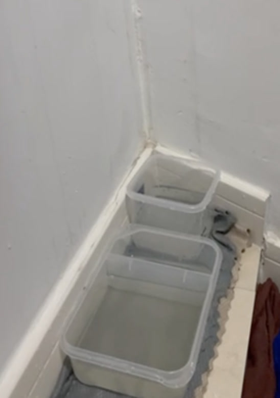 王女士家阳台的墙面已出现开裂,阳台窗框下方的水泥松动脱落。她翻出今年雨季拍摄的视频,雨水顺着阳台顶部往下滴落,地板上一片潮湿,她只能拿抹布在地上垫着,把塑料盆放在阳台接水。记者注意到,王女士家阳台窗户与外墙连接处被涂上了厚厚一层黑色防水材料,窗框下方也全都做了防水。“我多次反映阳台渗漏问题,每次都有施工人员到家中查看修补,这些防水涂料就是后来涂上的。可是做完一点效果都没有,还是接着漏。”王女士很无奈。