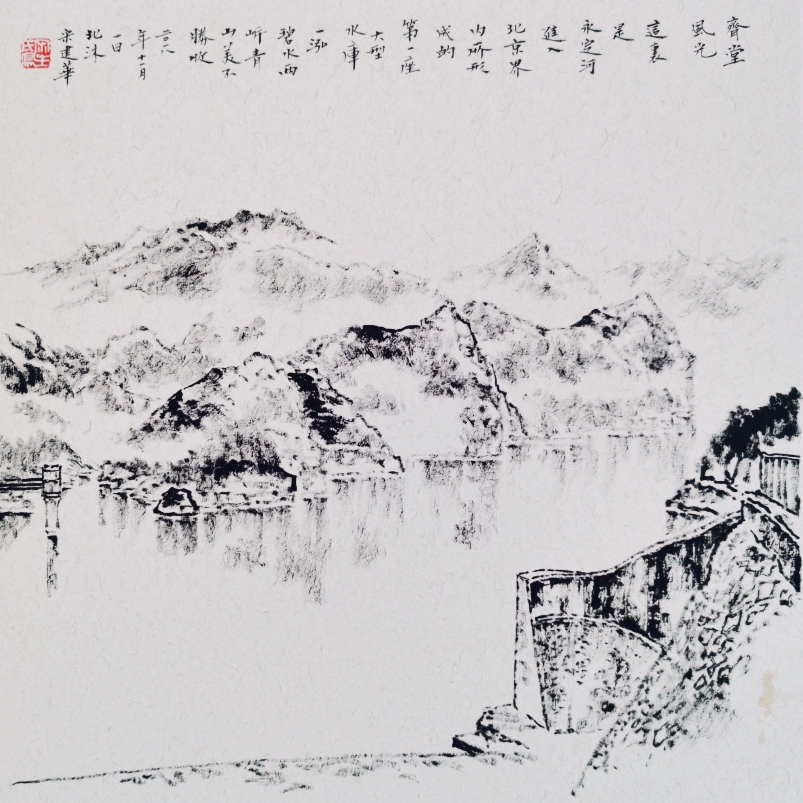 左突右撞地登上了高地,不禁心中大喜,放眼望去,一湖碧水倒影天光,三面秋山色彩斑斓,天风习习净波如练,水禽翩跹畅游云端,一时,我有些不知所措,受宠若惊地赶紧靠坐在石壁下,生怕惊扰了眼前的安详宁静。轻轻展纸,缓缓注墨,凝神品读这方人造如天成的美景,画笔也像这波光涟漪一样涓涓展开。