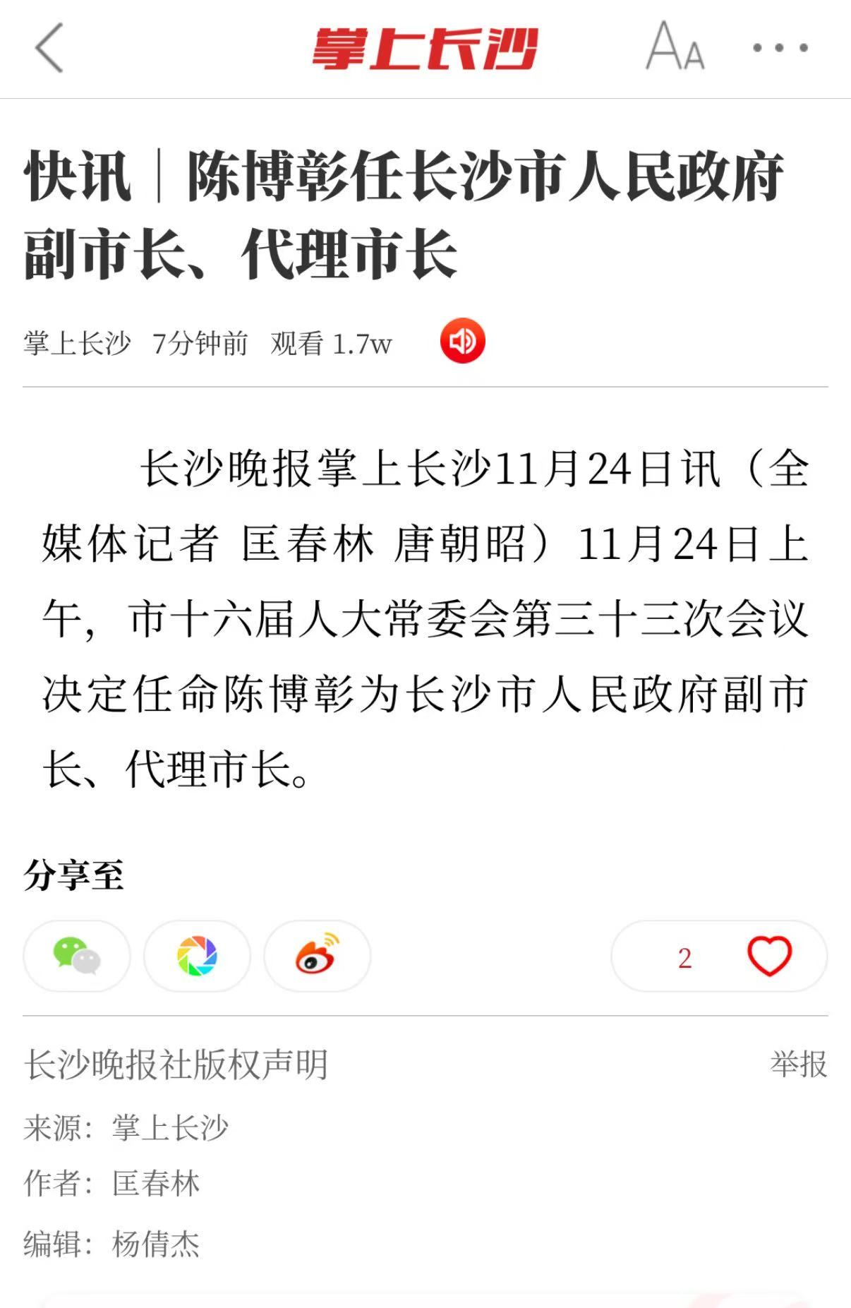 陈博彰任长沙市副市长、代理市长