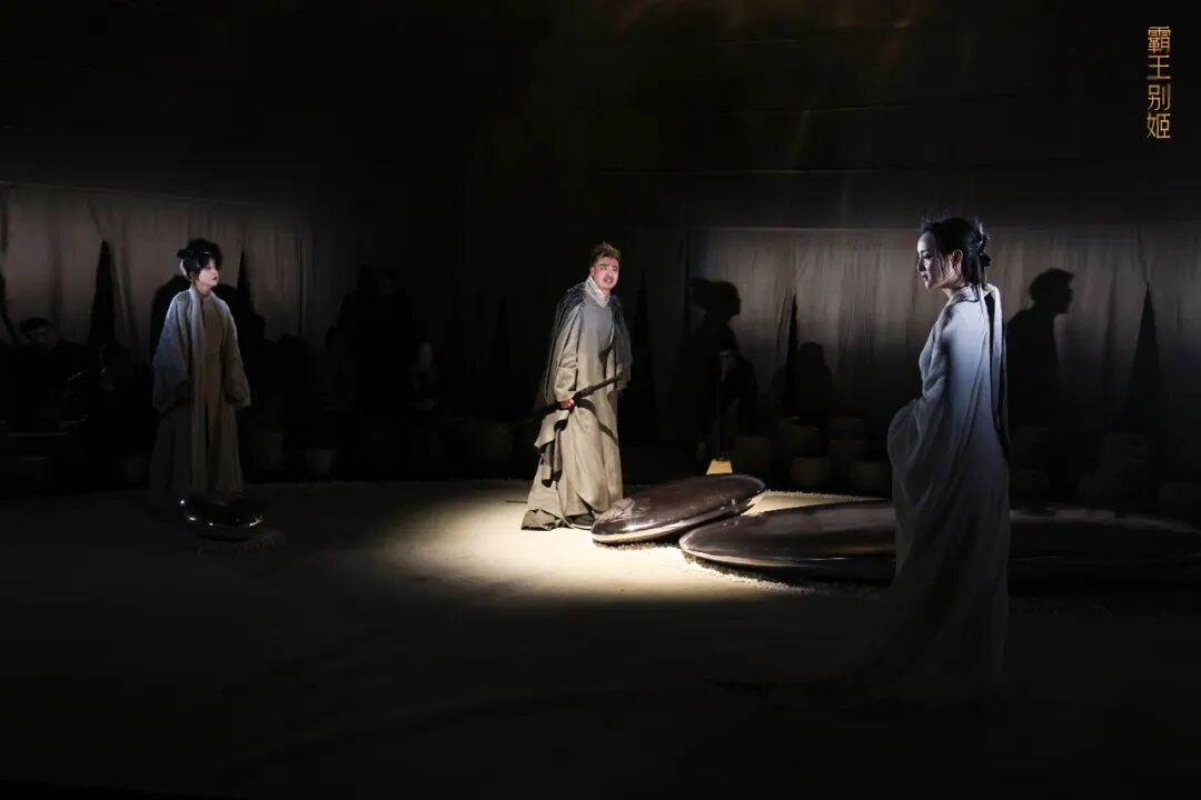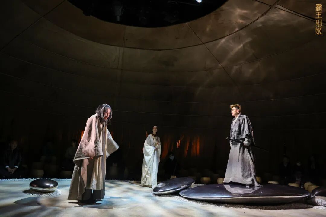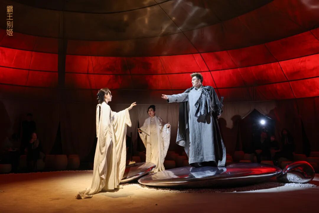 区别于传统的剧场布局,舞美设计王威极富创意地将剧场直接化作楚军营帐。一座球形中军大帐把表演区与观众席共同包裹其中,观众盘坐于蒲团之上,与演员近在咫尺,这种沉浸式的观演设计,让历史叙事更具感染力与代入感。配乐方面并未照搬过往旋律,而是在传统乐曲中融入现代音乐元素,通过环绕于营帐四周的音箱,营造出极具包围感的听觉空间,进一步强化沉浸式观剧体验。