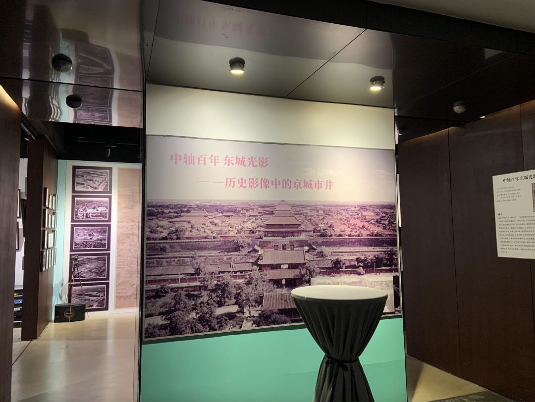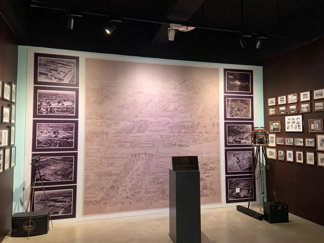步入展厅,一幅高清大尺寸的《京师生春诗意图》展现于观众眼前,这是清代画家徐扬于1767年(乾隆三十二年)创作的绢本设色画,原作现藏于北京故宫博物院。此图采用鸟瞰式构图,以紫禁城为中心,通过城墙、街道、民居及其他建筑构成全局,通过独特且鲜活的市民活动组成一幅井然有序充满生机的中轴画像,展现了在摄影技术出现之前画家笔下所描绘的中轴旧貌。围绕这幅图的是摄于20世纪40年代的10幅老北京航拍图,是记录当时老北京全景的珍贵资料。