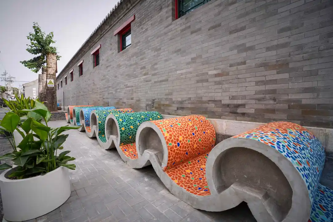 美术馆旁,艺术装置“一砖一瓦”格外吸睛:砖墙样貌的展架巍然矗立,彩色屋瓦覆扣延展,兼具观赏与休憩功能,互动感十足。