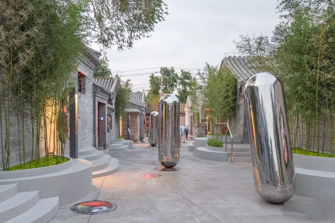 步入院落群,青砖灰瓦的传统建筑与现代艺术展品相映成趣,一段长约60米的腾退胡同空间被巧妙改造为通透的开放艺术走廊。
