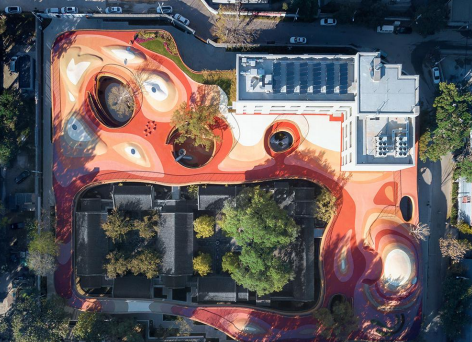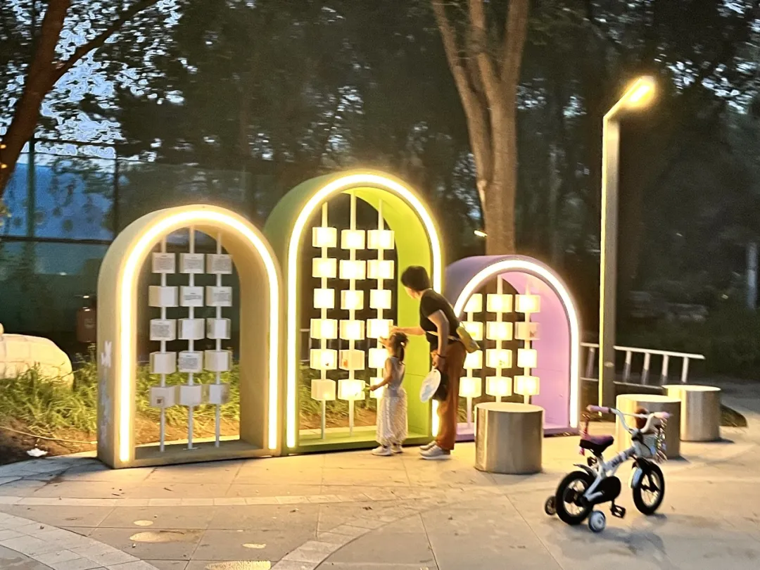 打造空间特色:在调整道路铺装,增加引导标识的基础上在场地植入游戏设施、小讲堂、合作实践、作品展陈等功能,巧妙地将“花园”与“生活”融为一体。
