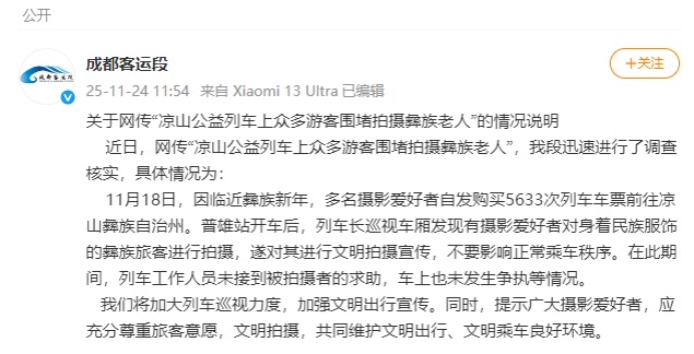 为啥非要对着一位老人拍个没完?据悉,作为大凉山地区重要的民生工程,5633次列车是当地群众出行、求学、做生意的“专线”,其中设有牲畜专用车厢,多数乘客是彝族群众。正因特别的民族文化氛围,这列来自大山深处的慢车成了“网红路线”,很多人慕名前来拍摄。如果经过被拍摄者同意,记录风土人情倒也无可厚非;可问题是,并非所有人都想被置于“长枪短炮”之下。如此肆意将他人日常生活当成景观、素材,不仅是对当事人的冒犯,更是对秩序与人文的破坏。