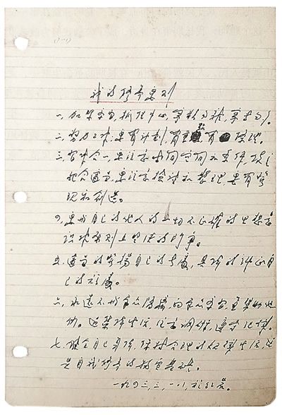第二条:“努力工作,要有计划、有重点、有条理。”抗战期间,周恩来在重庆主持中共中央南方局工作,并作为中共中央代表继续同国民党谈判,日常工作极其繁重,却能把各方面事务处理得井井有条。这与他科学的工作方法密不可分。