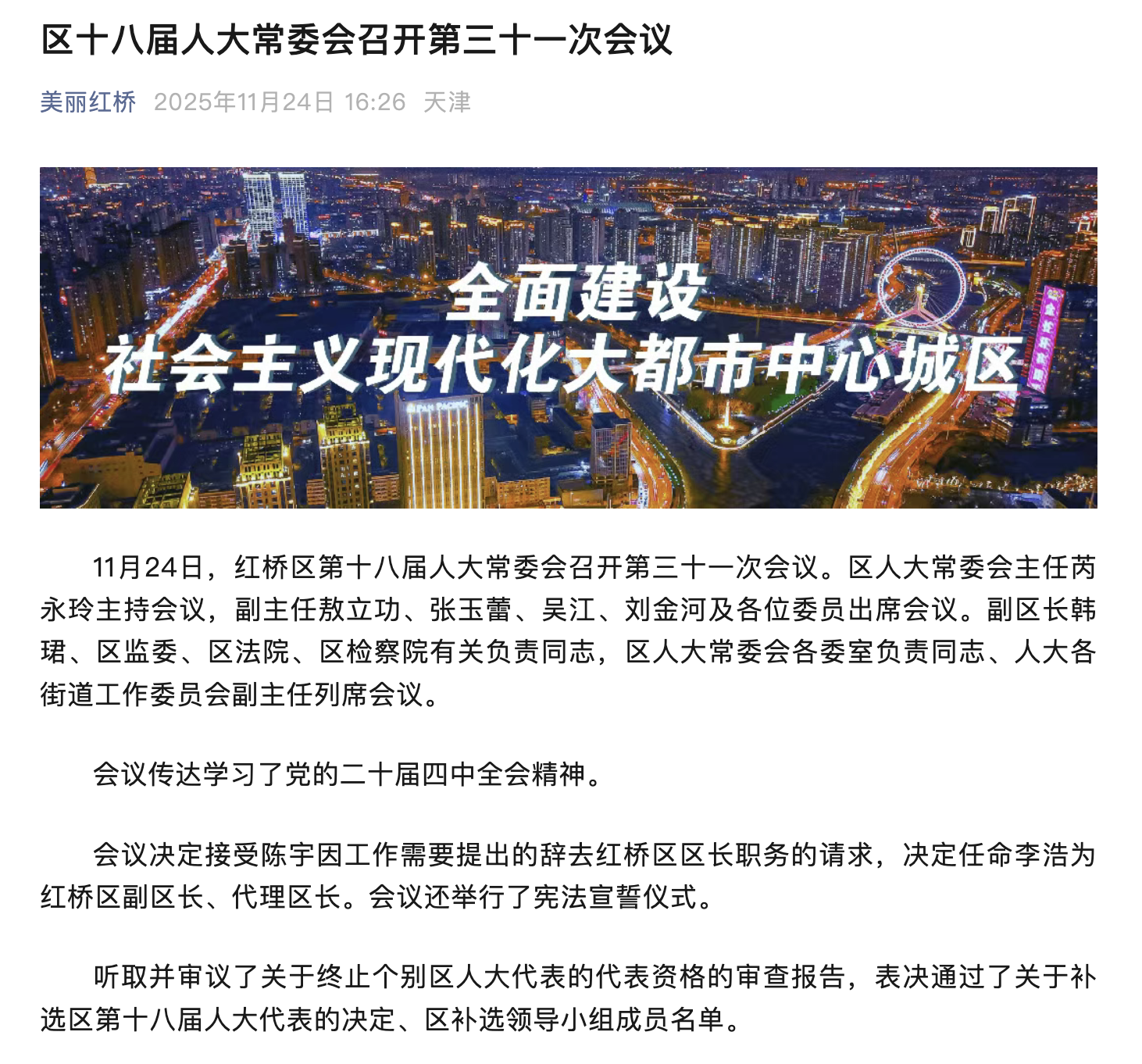 红桥区第十八届人民代表大会常务委员会第三十一次会议决定:李浩为红桥区代理区长。