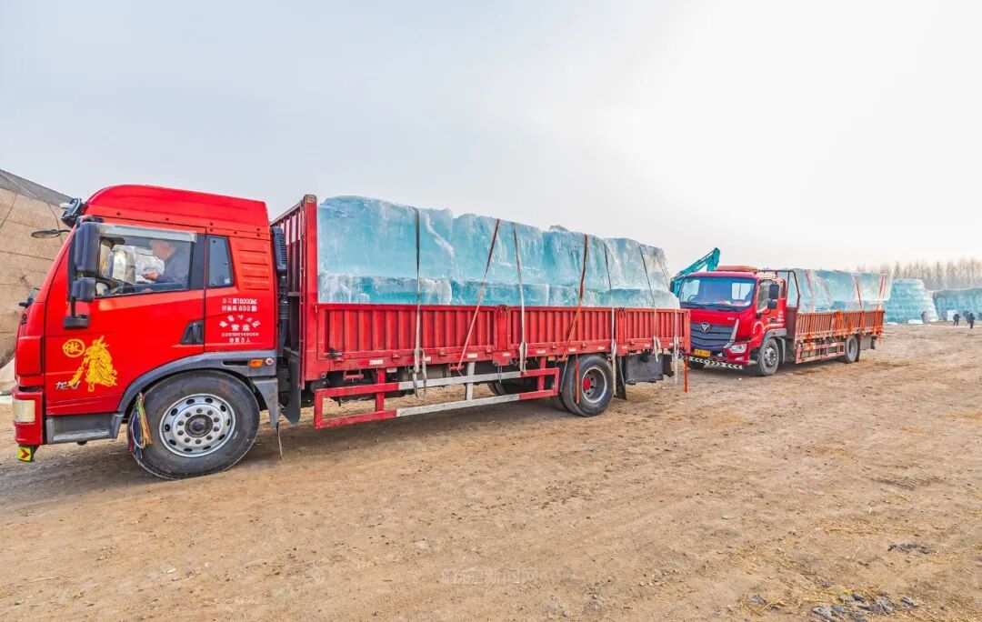 当日14时,记者抵达存冰场,现场一片忙碌景象,吊车、铲车、叉车配合默契。冰垛之上,工人们一字排开,齐心协力将覆盖幕布向上拉起,犹如揭开一场盛大的序幕。紧接着,叉车将不合格的冰块移至下方,再将优质的冰块小心翼翼地放置在货车之上。