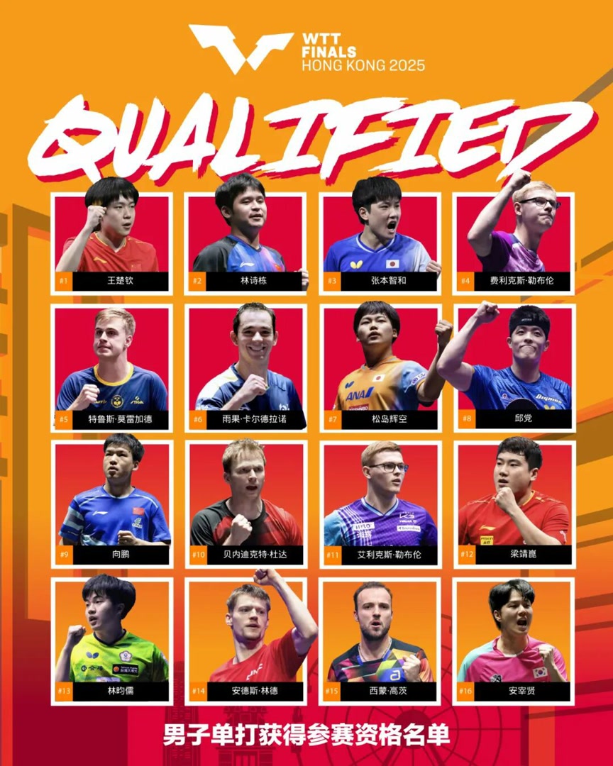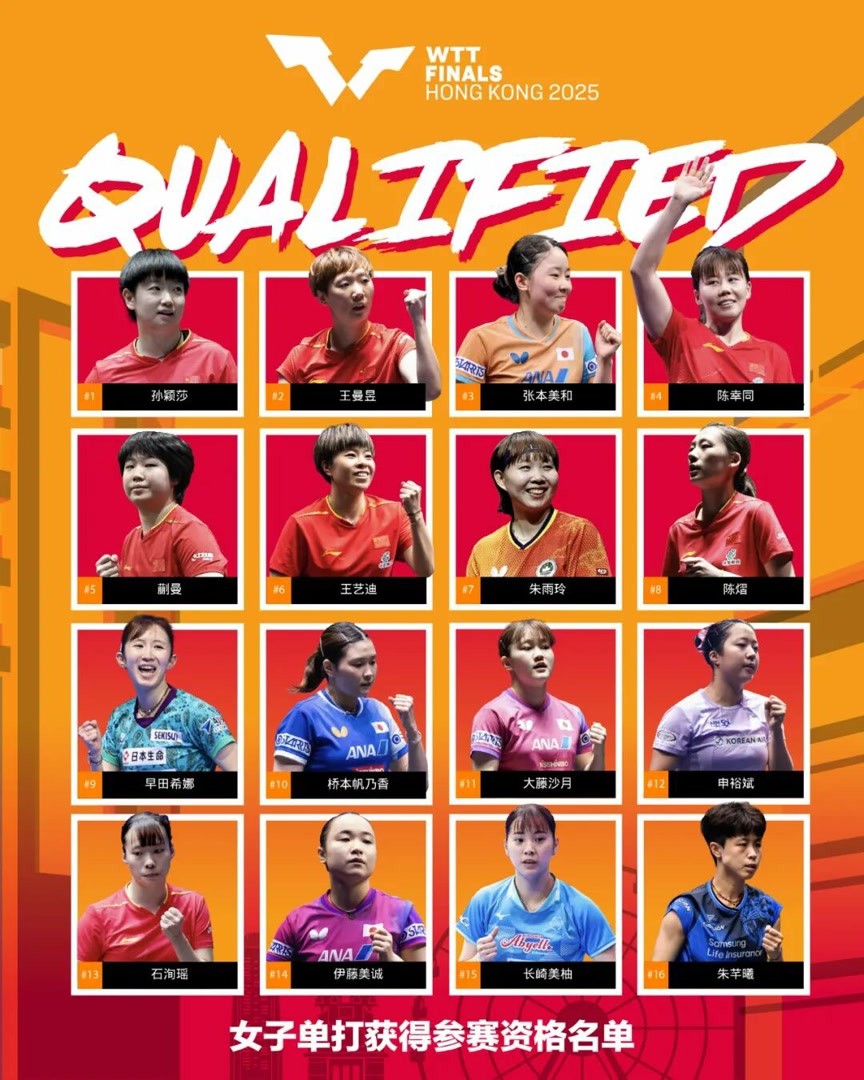 北京时间11月24日,WTT世界乒乓球大联盟公布了香港总决赛入围名单。中国队共有四名男选手和七名女将获得单打参赛资格,混双则仅有林诗栋/蒯曼一对选手入围。
