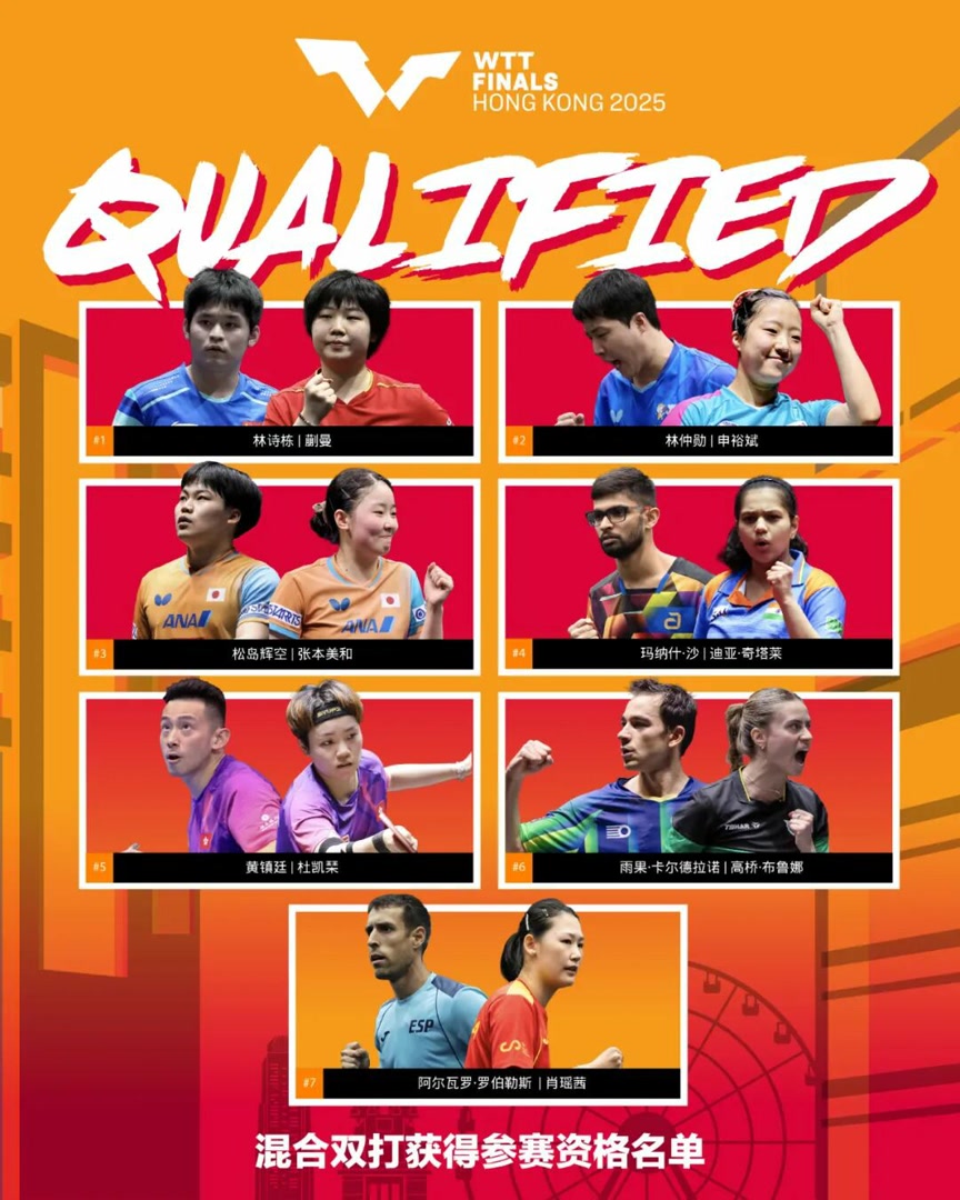 与男、女单打资格已经确定不同,此次公布的混双名单则只有七席——还有一个外卡名额尚待公布。在已公布的名单中,中国队仅林诗栋/蒯曼获得参赛资格,两人在积分榜上高居首位。仅参加了中国大满贯并一举夺冠的王楚钦/孙颖莎排在第九位,无缘直接入围。