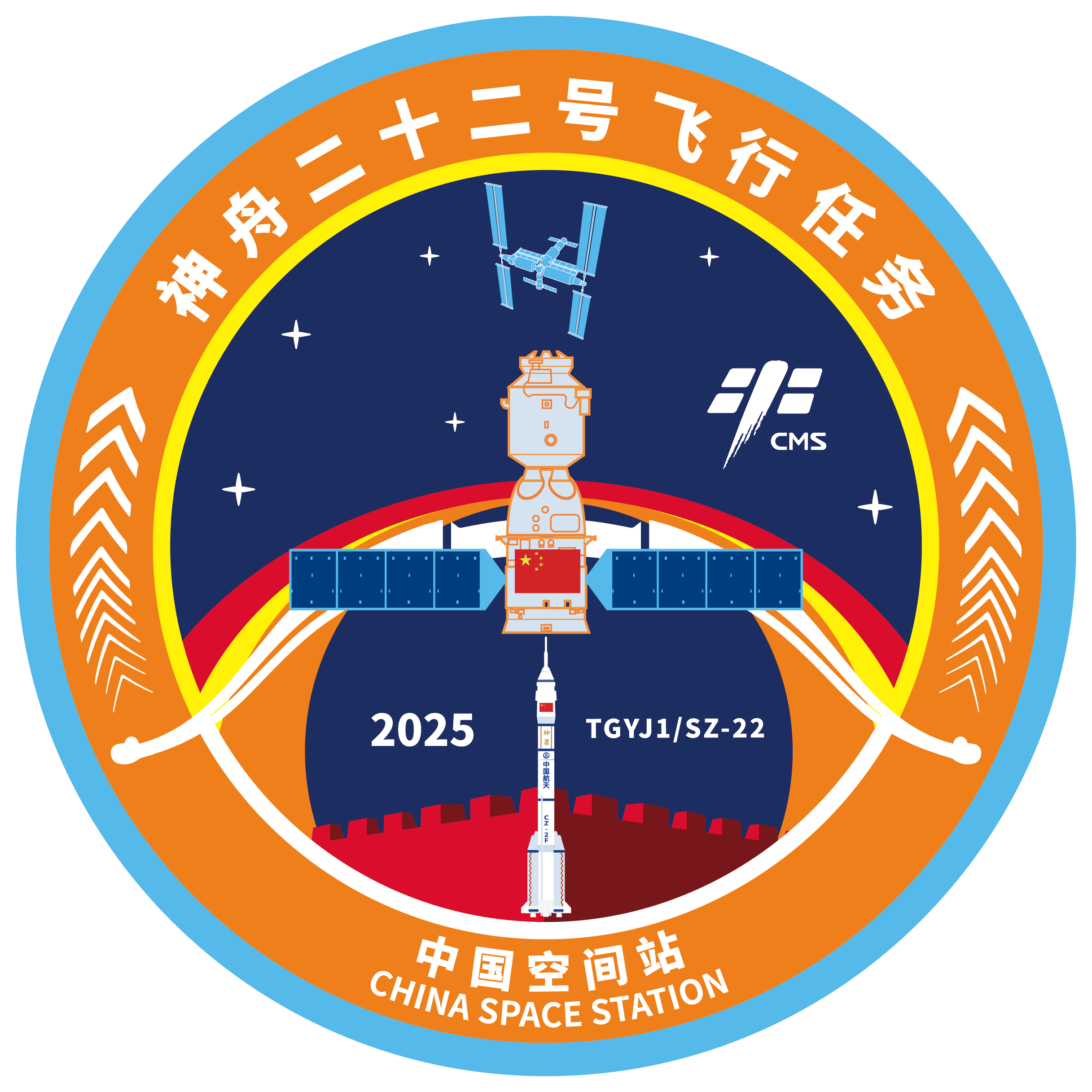 神舟二十二号飞行任务标识融合了中国航天元素与传统文化符号,标识以长城图案为基底,体现对航天员生命安全的庄严承诺;弓箭造型与长征二号F运载火箭、神舟飞船构成视觉主体,展现“蓄势待发”的力量感与“使命必达”的坚定信念;二十二支利箭环绕四周,精准呼应任务编号。