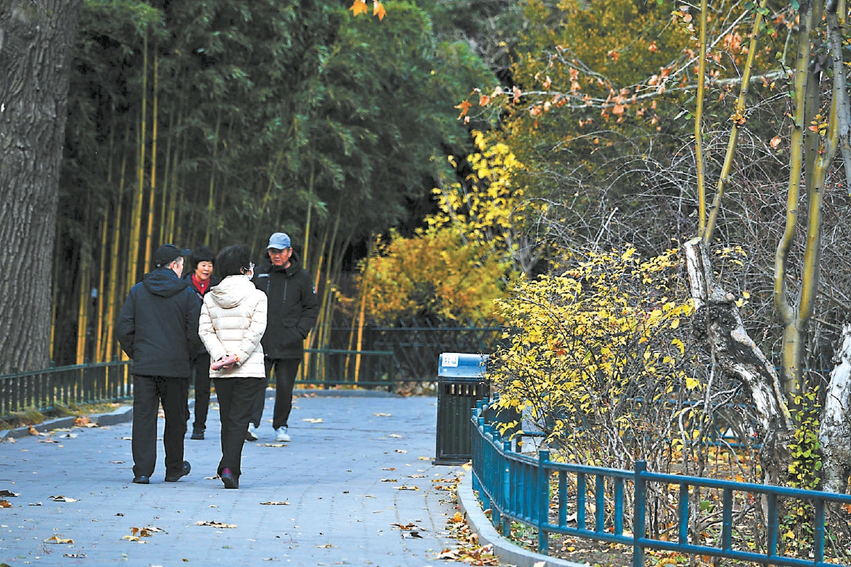 缓扫落叶的公园不止一家。圆明园里,厚厚的金黄叶片铺满步道,形成柔软的“金色地毯”,脚踩上去发出窸窸窣窣的声响,奏响专属秋日的乐章。玉渊潭公园在东北大堤元宝枫集中观赏区、桥下西门至纪念碑广场银杏集中观赏区、樱花园水杉观赏区以及游客无法进入的草坪地,都采取了落叶缓扫的措施,延长彩叶的观赏期。“这些堆积的落叶才是秋末冬初该有的样子!”一位带着孩子在圆明园里踩树叶的市民说,带着孩子一起捡落叶、踩树叶、辨认不同树木的叶片形状,是让孩子了解大自然的最好方式。