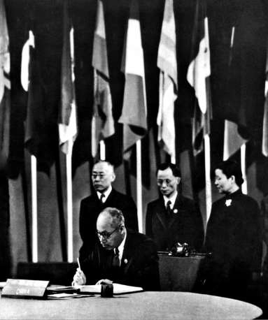中国代表团董必武在《联合国宪章》上签字。