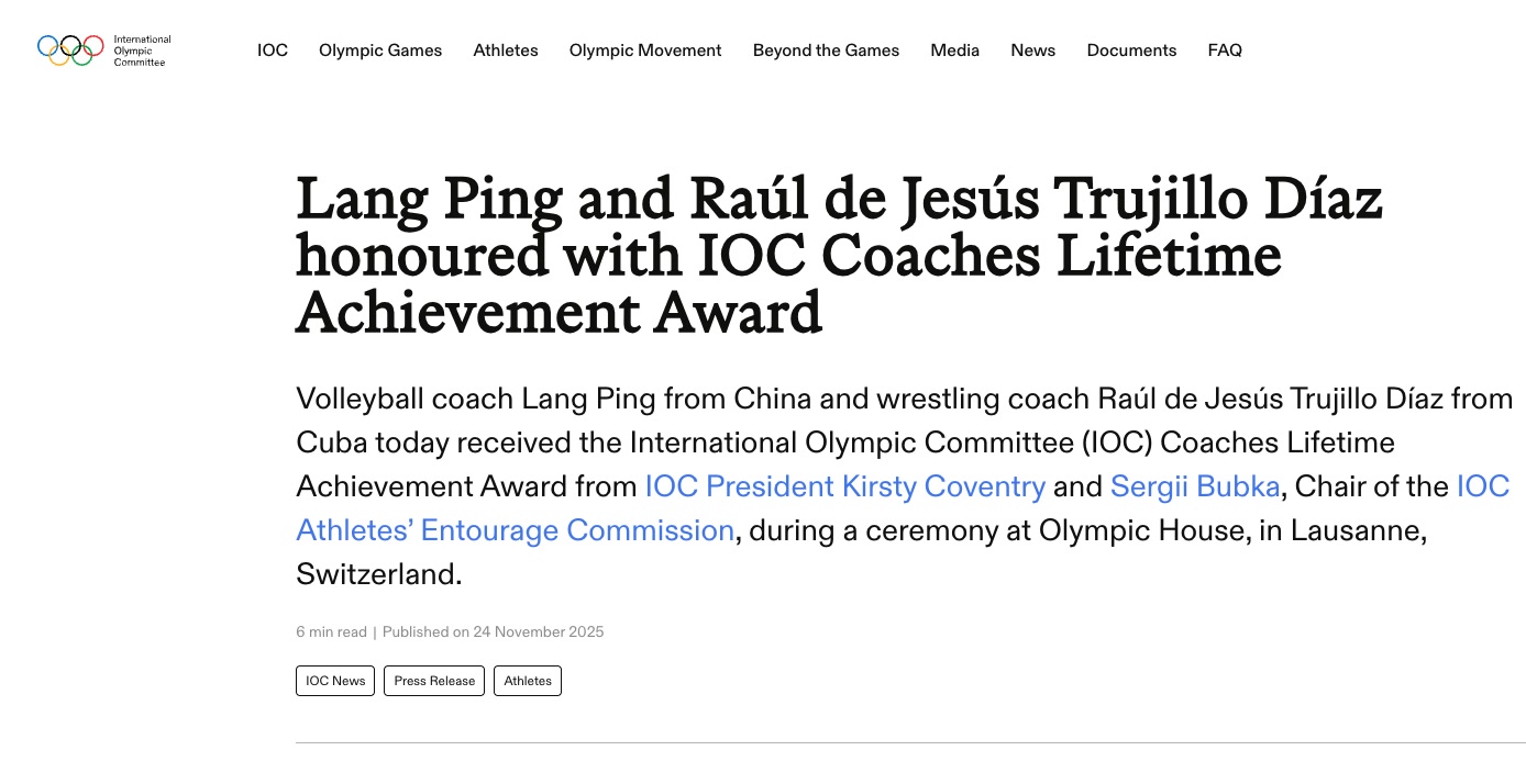 在郎平获得该奖项后,中国排球协会发文表示祝贺,“祝贺郎平指导获得2025年国际奥委会教练终身成就奖!郎平曾于1995年至1998年和2013年至2021年担任中国女排主教练,带领球队获得2015年女排世界杯、2016年里约奥运会和2019年女排世界杯冠军,为中国排球做出了卓越贡献。”