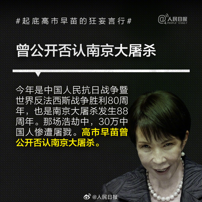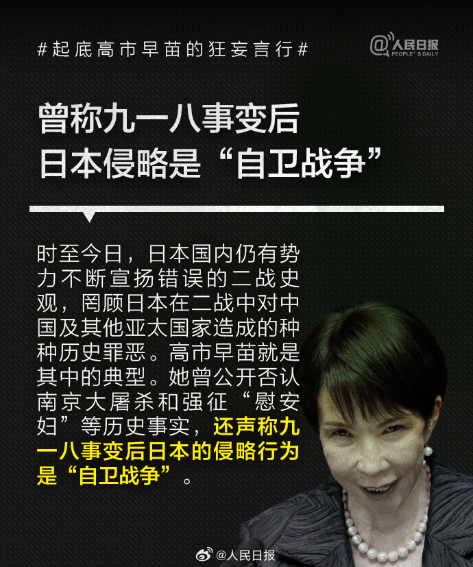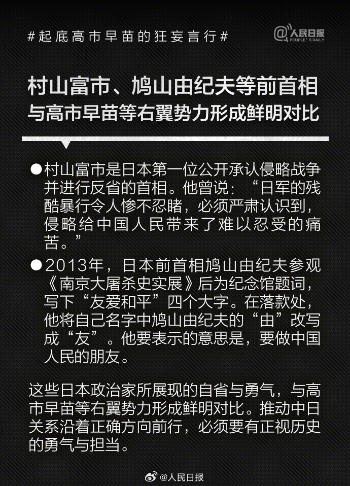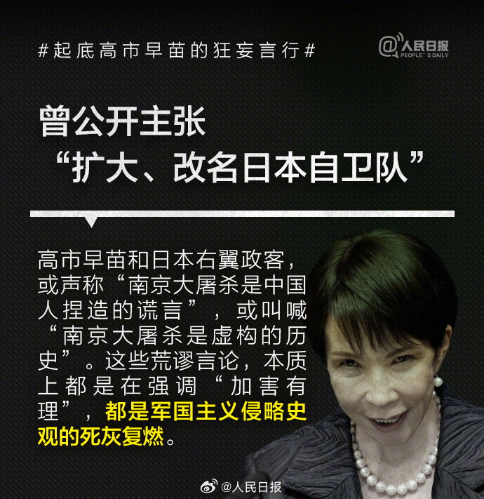 1993年高市早苗当选日本国会议员后,公开主张修改日本和平宪法、扩大和改名日本自卫队、参拜靖国神社,其言行与许多臭名昭著的日本右翼政客如出一辙。