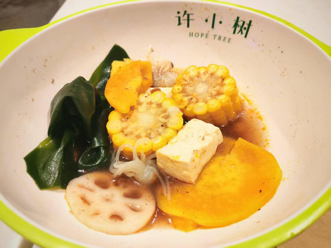 两个海带结、两段冻玉米、两块豆腐、两片藕、两片红薯、两个魔芋结,记者拿着这些食材到许小树北京SKP店收银台称重结账。“23.3元。”服务员收款同时送上小票,上面印着单价79.8(元/千克)、数量0.292(千克)、总价23.3(元)。店里挂着的公示牌显示:“自选汤煮食材均一价,39.9元/500克。”